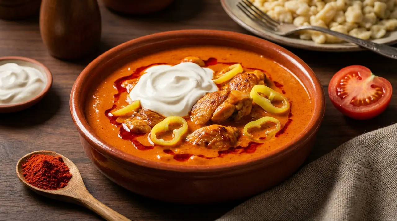 Paprikas martas er en ungarsk paprikasauce, uadskillelig fra kyllingen den koges med. Kyllingen simrer i en paprika-løgbund til den er moer, hvorefter saucen jaevnes med en creme fraiche- og melblanding. Paprikaen er stjernen – brug ægte ungarsk sød paprika. Kyllingen brunes ikke; den koger i saucen og afgiver sin saft til at opbygge smag.