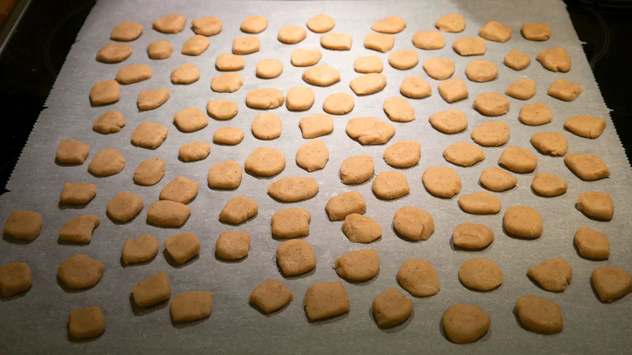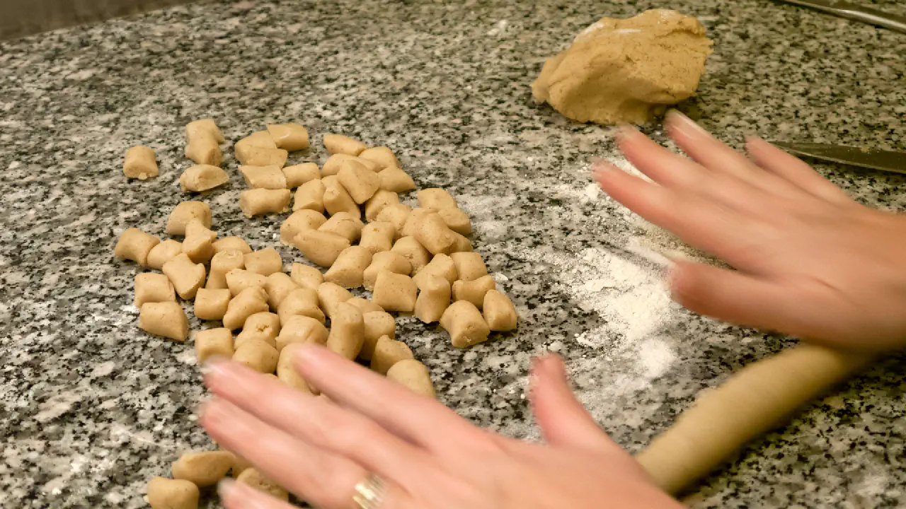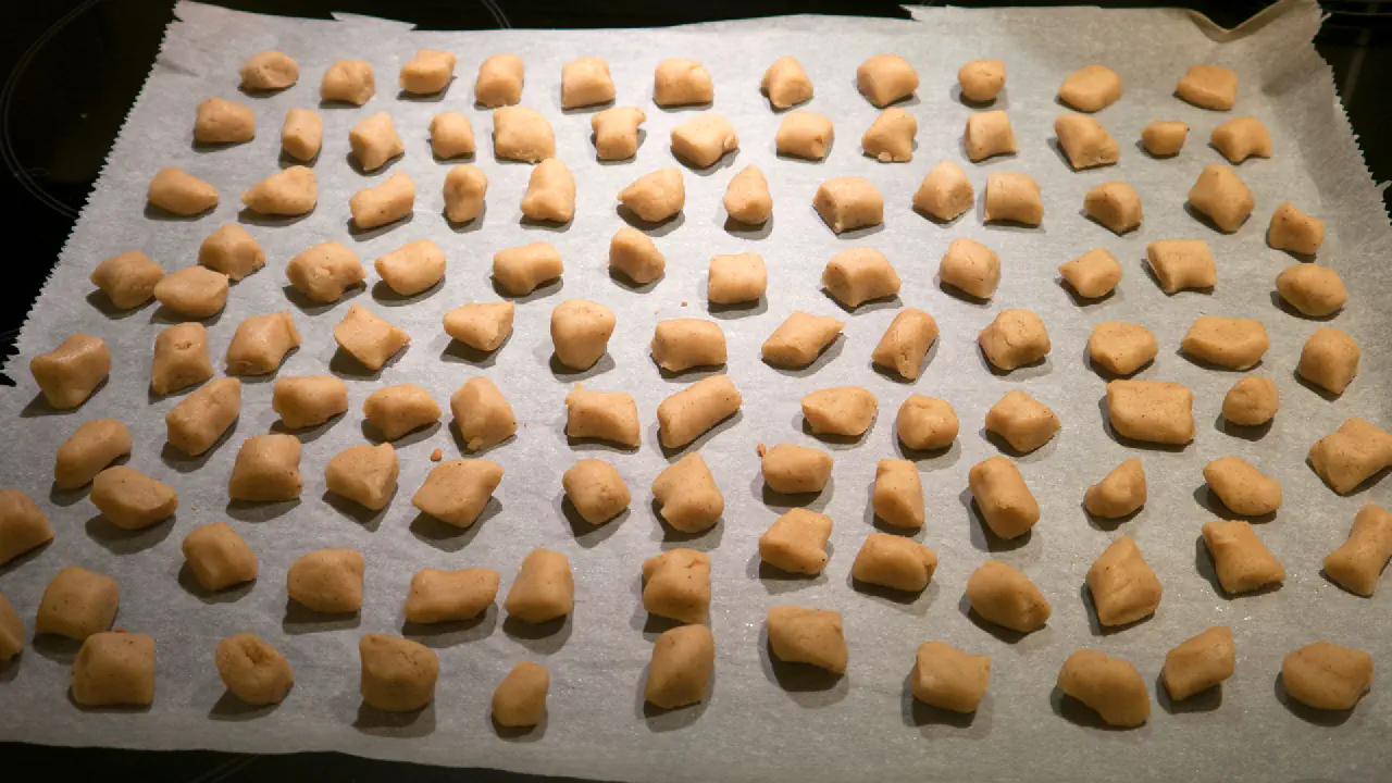 Rul hver del ud i en lang tynd rulle. Ca. 1 cm tyk. Skær dem ud i stykke på ½-1 cm. De skal være mindre end du regner med.