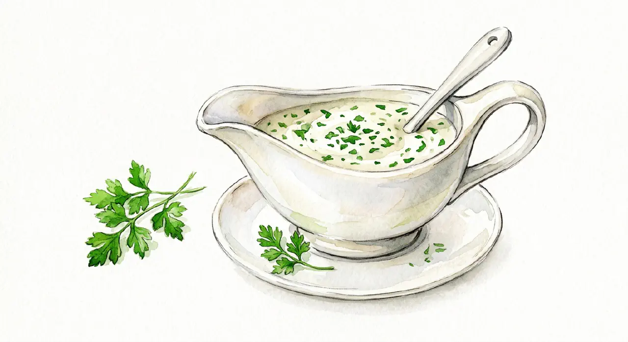 Persillesovs er den mest klassiske danske sovs — en hvid mælkesovs jævnet med mel og fyldt med hakket persille. Den hører til stegt flæsk og kogt torsk, men passer til alt fra frikadeller til kogte kartofler. En grundopskrift, man skal kunne.