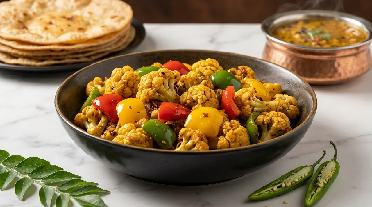 Phul gobi er en tør blomkålsret fra det nordlige Indien. Navnet betyder simpelthen “blomkål” på hindi, og retten holder sig til det basale: blomkål, løg, peberfrugt og grøn chili steges i ghee med gurkemeje og salt. Ingen sovs, ingen tomat, ingen tunge krydderiblandinger.