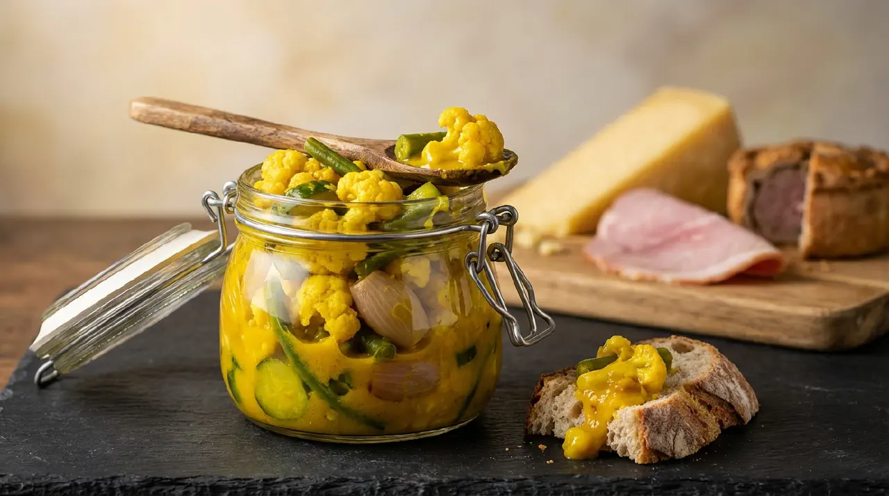 En stærkt gul britisk sennepssyltning af blandede grøntsager i en krydret, eddike-baseret sauce jævnet med mel. Den opstod som en britisk tilpasning af indiske pickles og har eksisteret siden midten af 1700-tallet. Gurkemejen giver den sin karakteristiske farve. Serveres til koldt kød, ost, pork pies eller ploughman’s lunch.