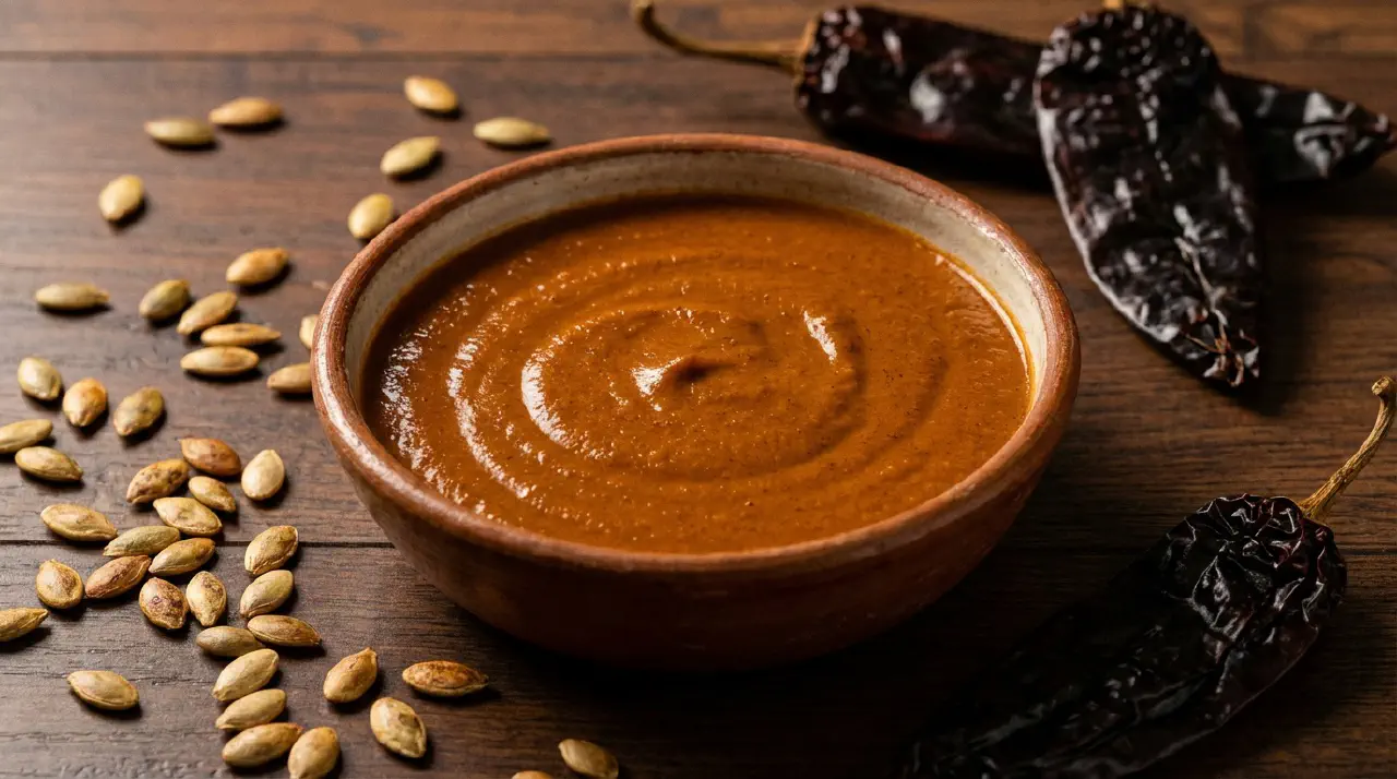 Pipian rojo er en mexicansk græskarkerne-sauce fra Puebla og omradet omkring, bygget på tørrede anchochilier og varme krydderier. Teknikken: rist kernerne, blend alt, steg pureen og simrer med bouillon.