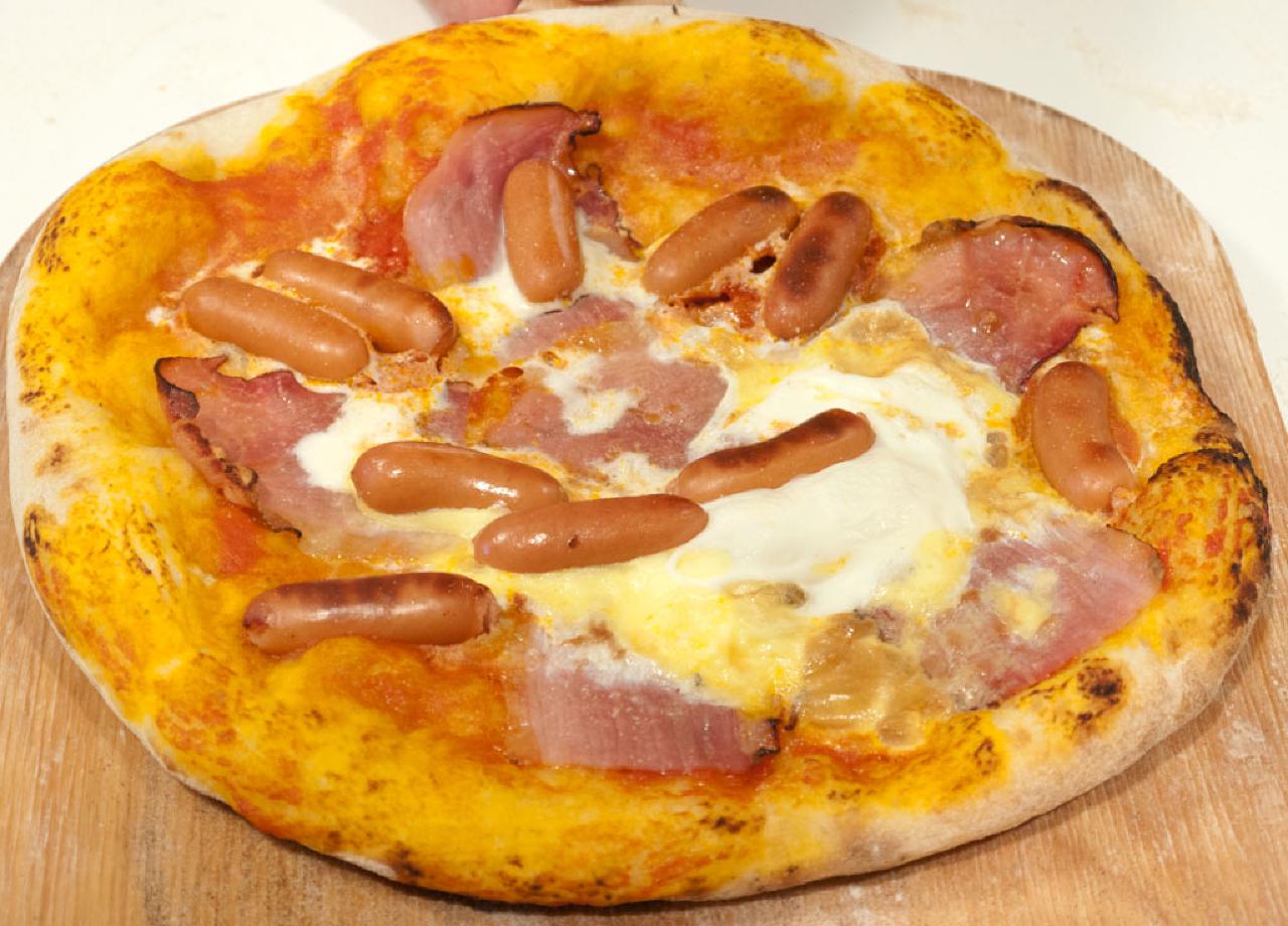 Morgenmadspizza m. bacon, æg og pølser … © kvalimad.dk