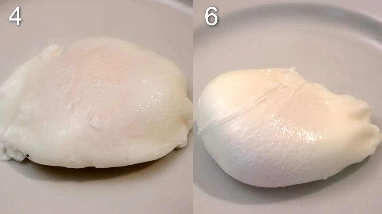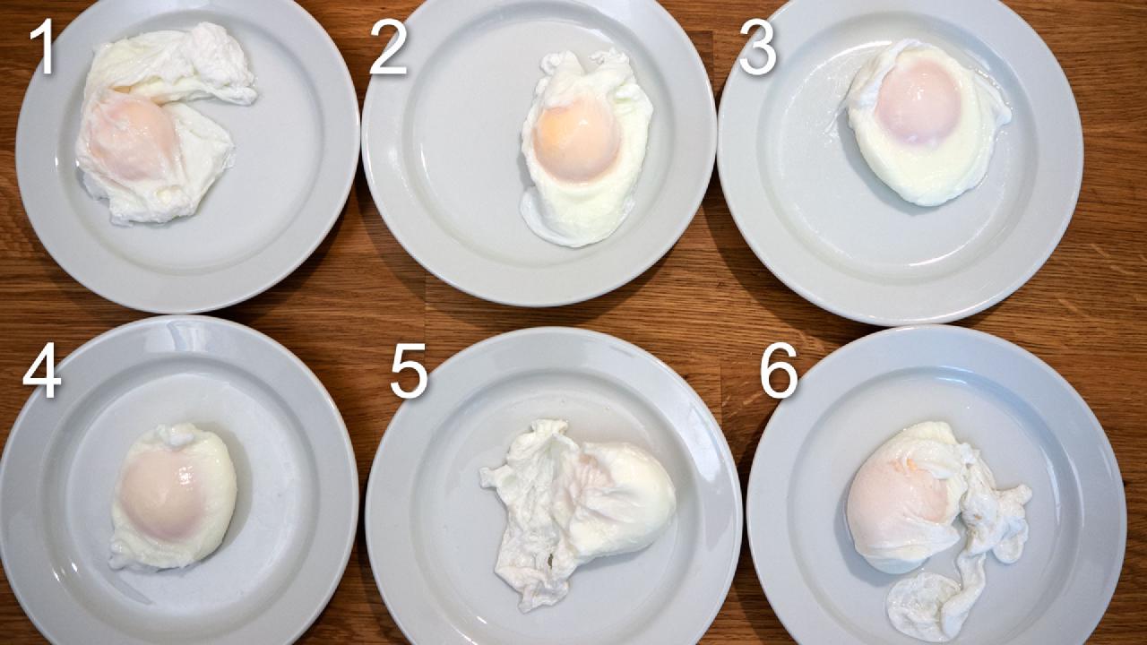 Pocherede æg closeup. 4) uden eddike. 6) med eddike. © kvalimad.dk