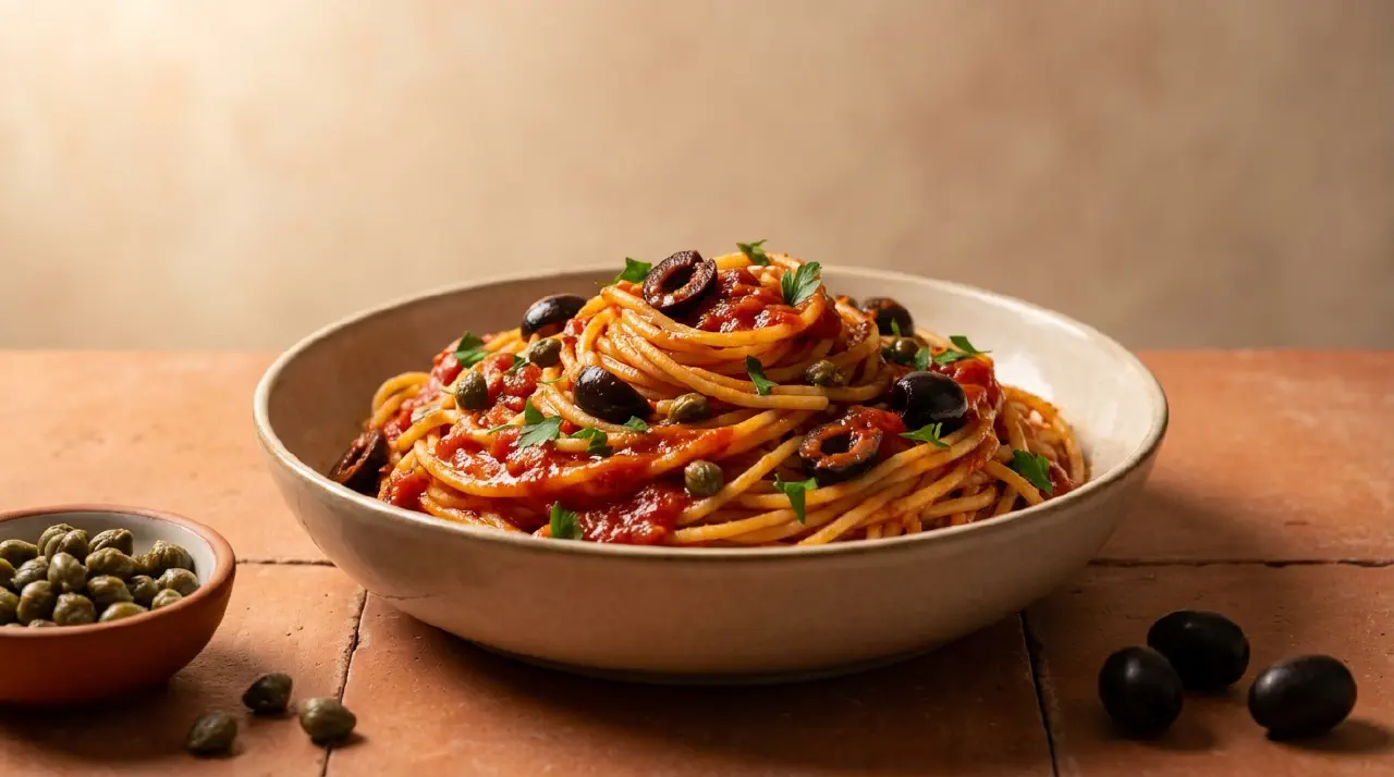 Puttanesca er en napolitansk pastasauce bygget på ansjoser, oliven, kapers og tomat. Ansjoserne opløses i olien og giver en umami-backbone – den færdige ret smager ikke af fisk. Traditionelt serveret med spaghetti, uden ost.