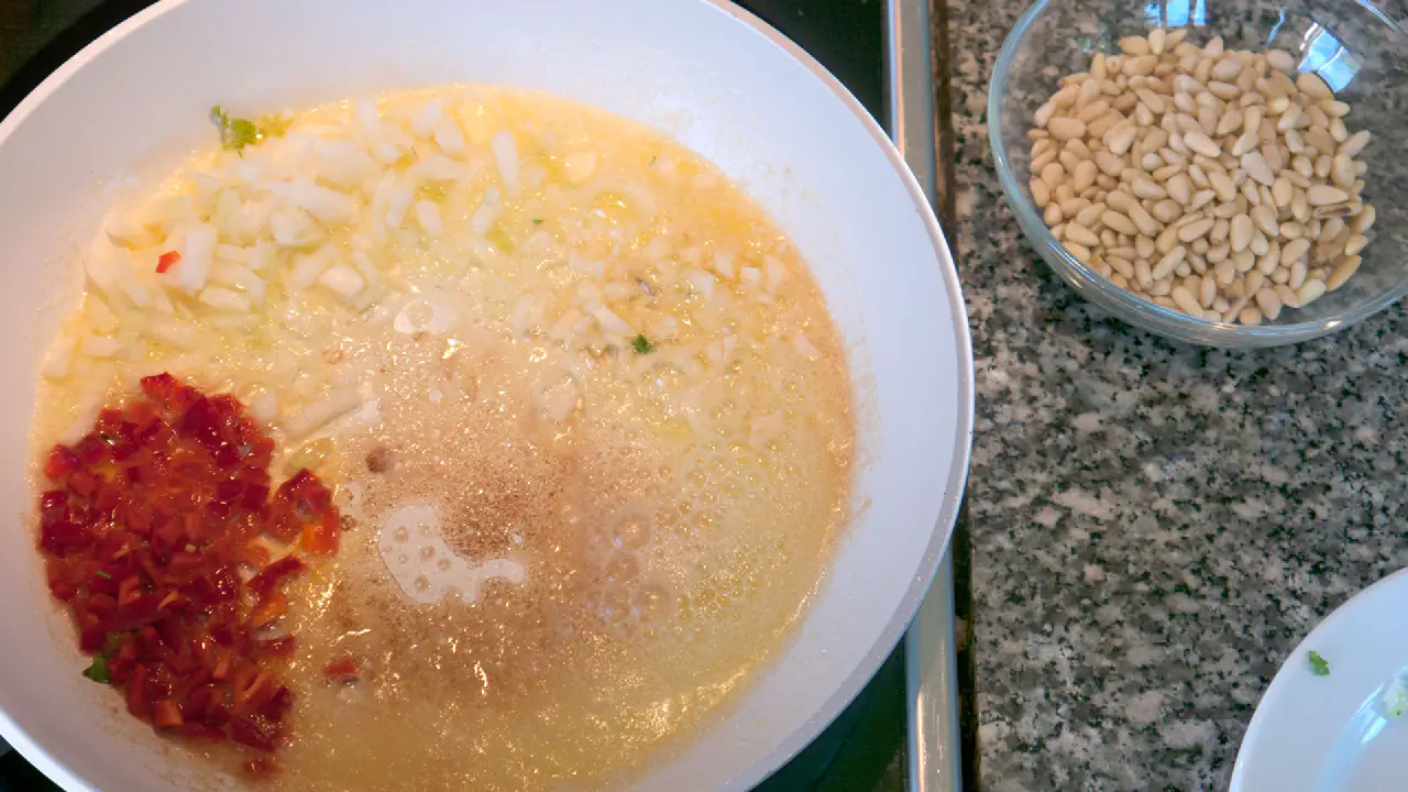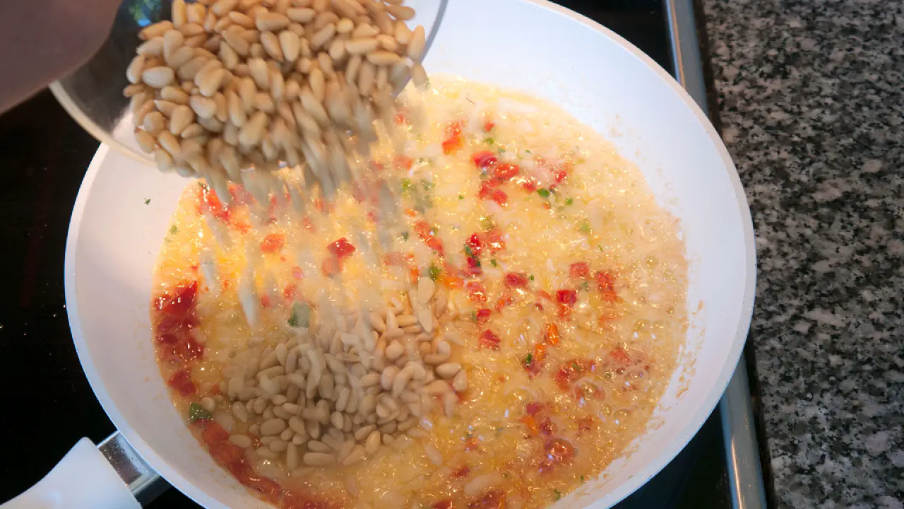 Tilsæt pinekernerne og rist dem let. De må ikke blive sorte.