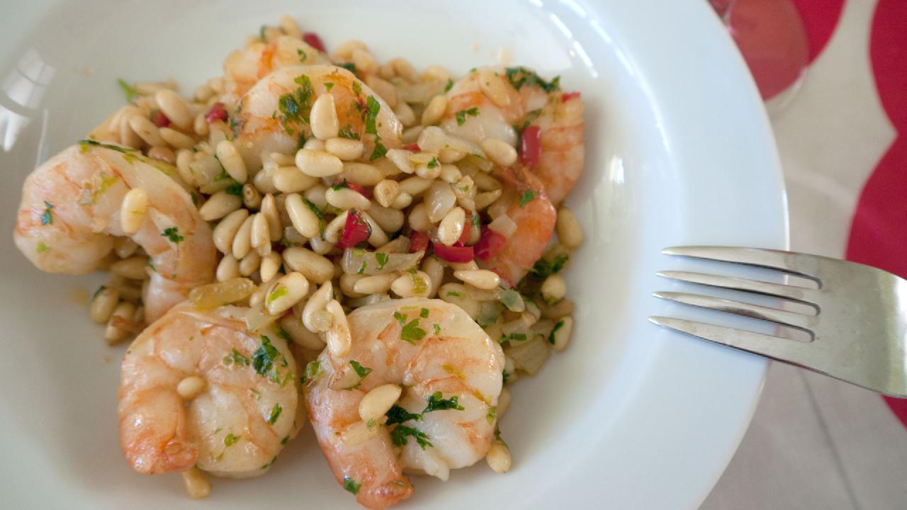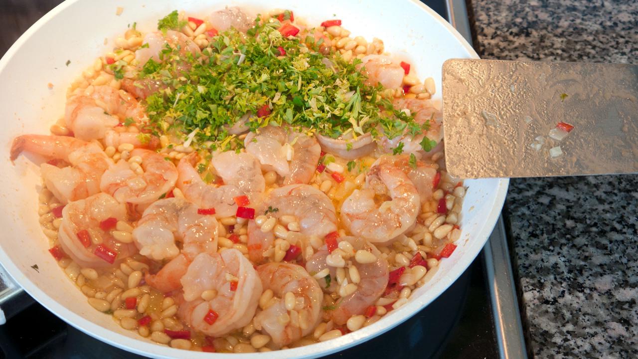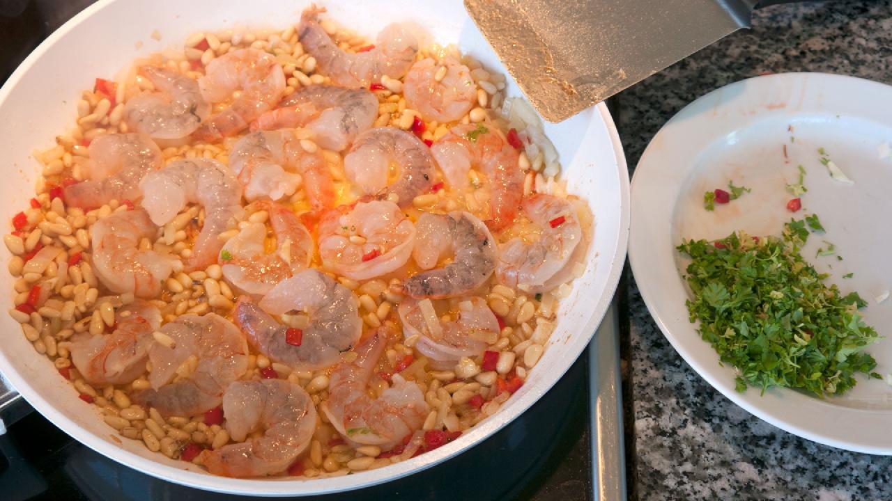Et af mine yndlingssteder i Berlin er gaderestauranten Rogacki. Man står op og spiser, der er en frygtelig larm og maden bliver lavet lige ved siden af. Det er et skønt sted. En af mine yndlingsretter der er “Garnelen mit pinienkernen”, så den har jeg prøvet at efterligne her, og jeg syntes jeg er kommet ret tæt på.
