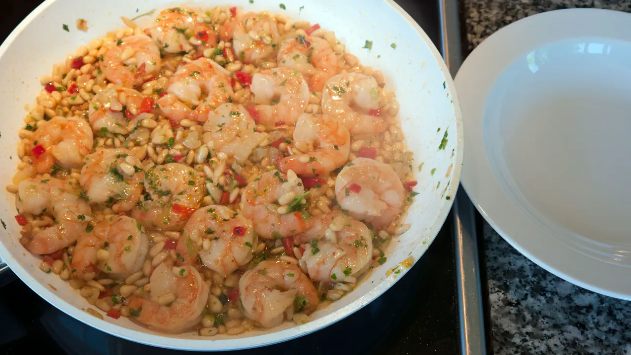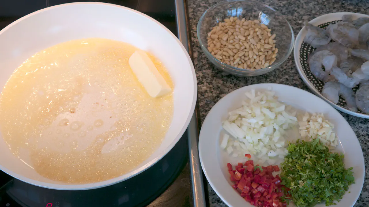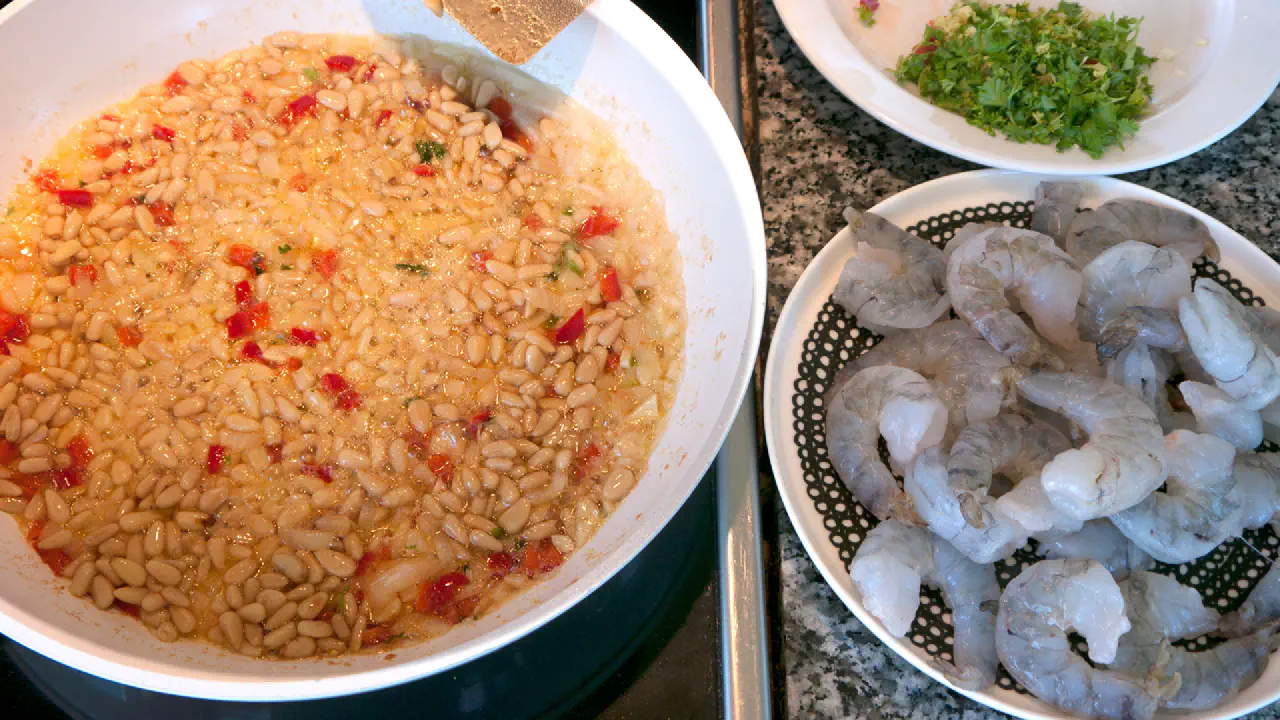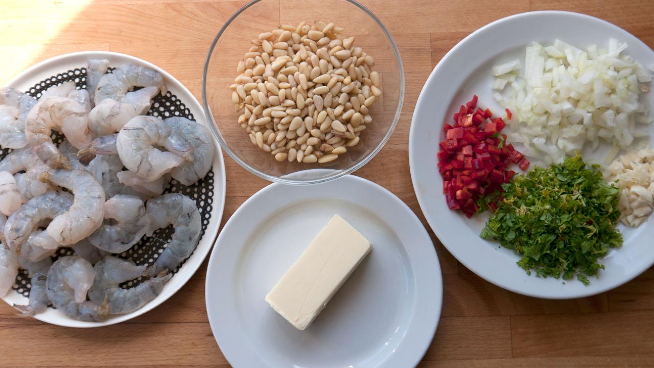 Et af mine yndlingssteder i Berlin er gaderestauranten Rogacki. Man står op og spiser, der er en frygtelig larm og maden bliver lavet lige ved siden af. Det er et skønt sted. En af mine yndlingsretter der er “Garnelen mit pinienkernen”, så den har jeg prøvet at efterligne her, og jeg syntes jeg er kommet ret tæt på.