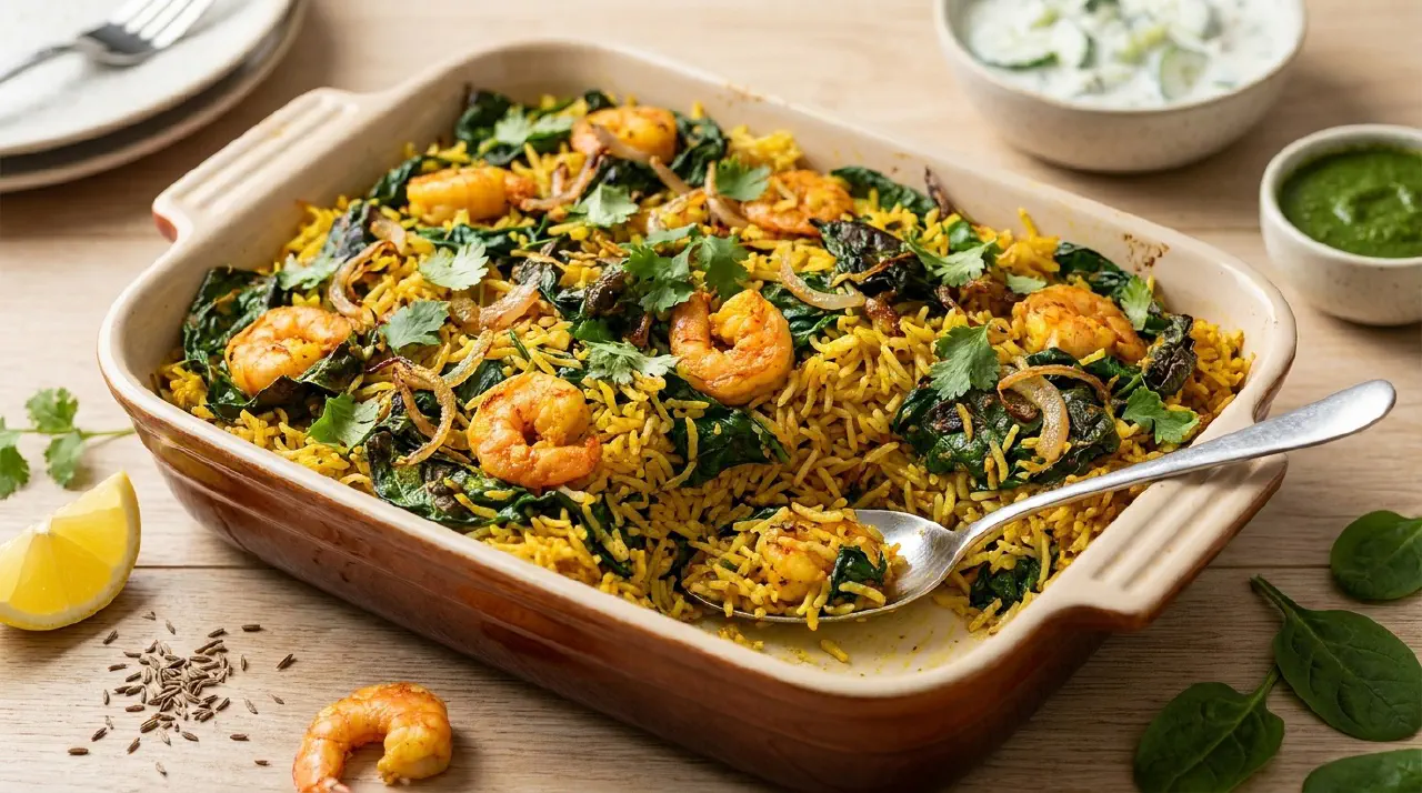 Jhinga palak biryani er en ovnbagt ret fra det indiske køkken, hvor smørstegt basmatiris lægges i lag med krydret spinat og rejer. Smagen er varm og krydret fra chili og koriander, jordet fra spinaten og let smørret fra risen — et komplet måltid, der serveres som det er eller med en klat raita ved siden af.