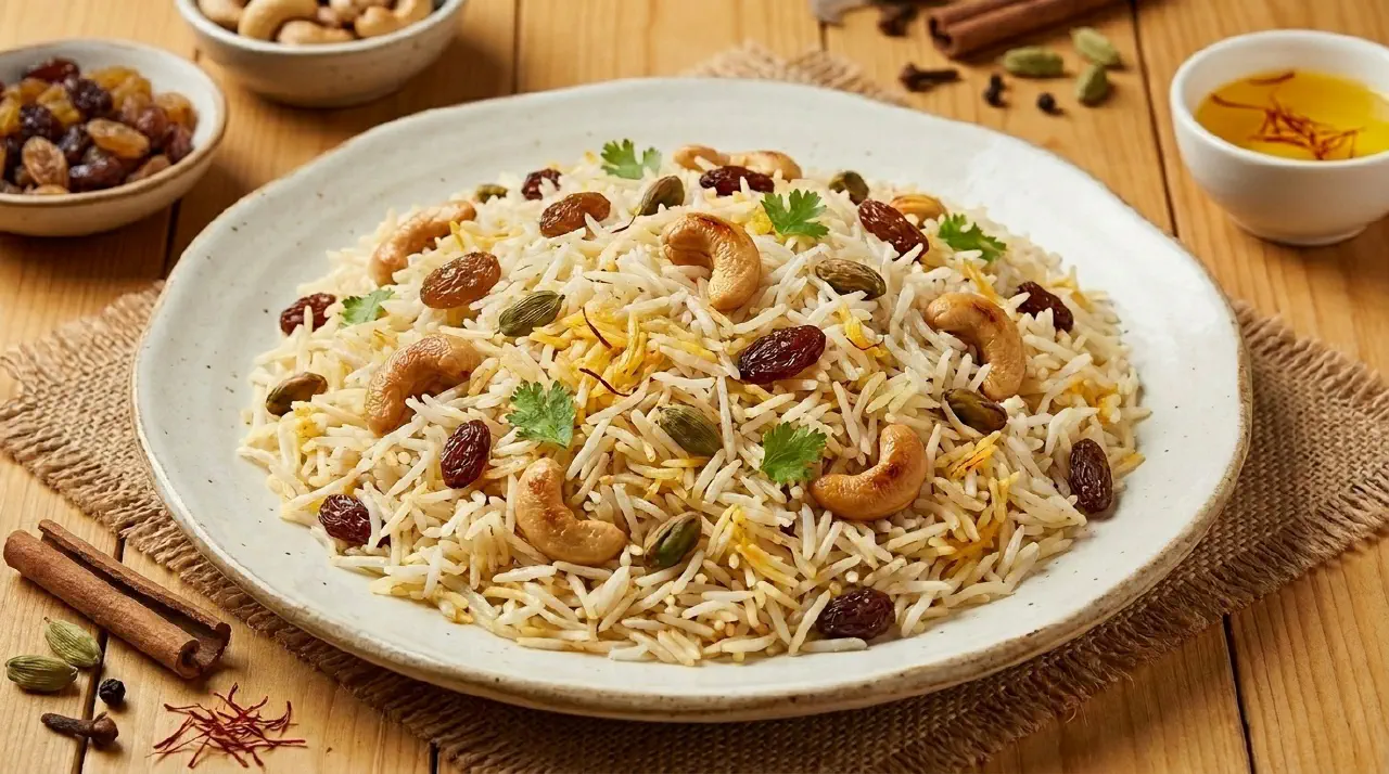 Kashmiri pulao er en duftende basmatipilaf med hele krydderier, safran og et strejf af appelsinblomstervand. Den bliver toppet med ristede cashewnødder, pistacienødder og små rosiner, så hver skefuld skifter mellem blødt ris, sprødt og sødt.