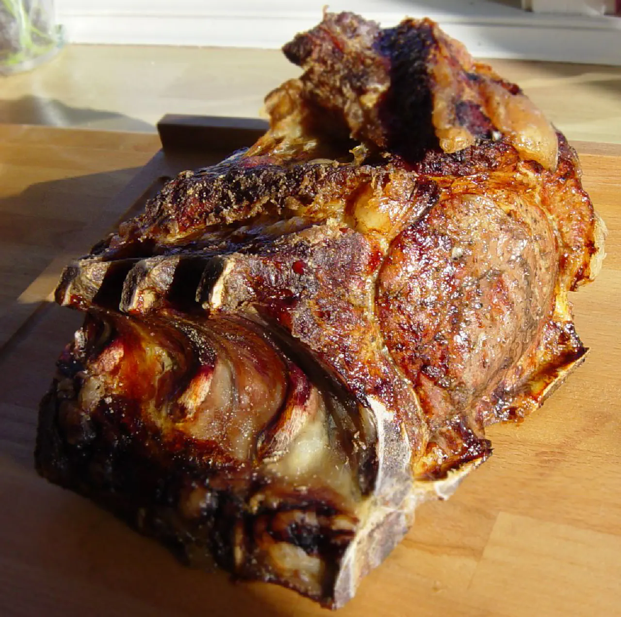 Okse- og kalve-højreb er et smukt stykke kød. Det røde marmorerede kød der sidder på de afskårne ribben. Det er ikke en udskæring vi normalt ser hos slagteren, men han kan godt lave den hvis man spørger. Ellers gå til halal slagteren, som har den med garanti. Jeg helsteger den som regel i min gril, hvor den får en mild røgsmag af Rosmarin. Det vækker julelys i øjnene hele året rundt når det store stykke kød bliver sat på bordet.