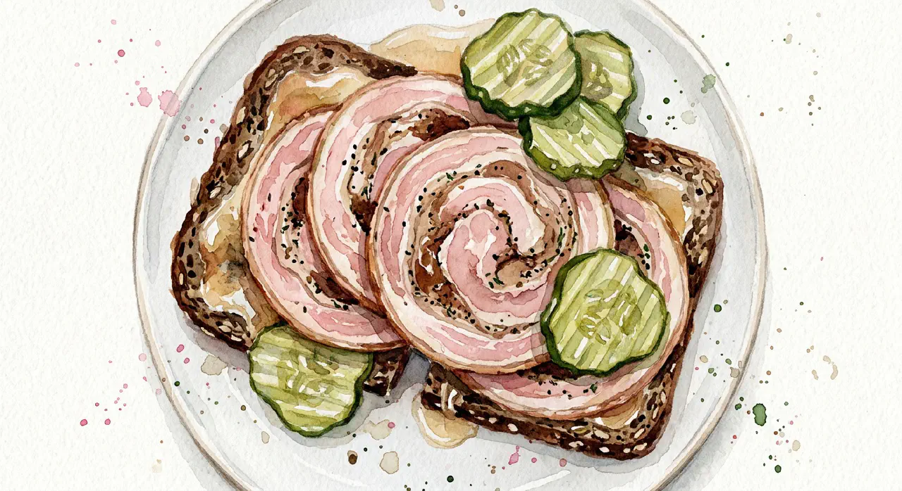 Rullepølse er en klassisk dansk charcuteri — et svineslag saltet i lake, krydret med allehånde, muskat og merian, rullet sammen, kogt og presset. Den serveres i tynde skiver på rugbrød, typisk med sky og pickles. Et uundværligt element i dansk frokostkultur.