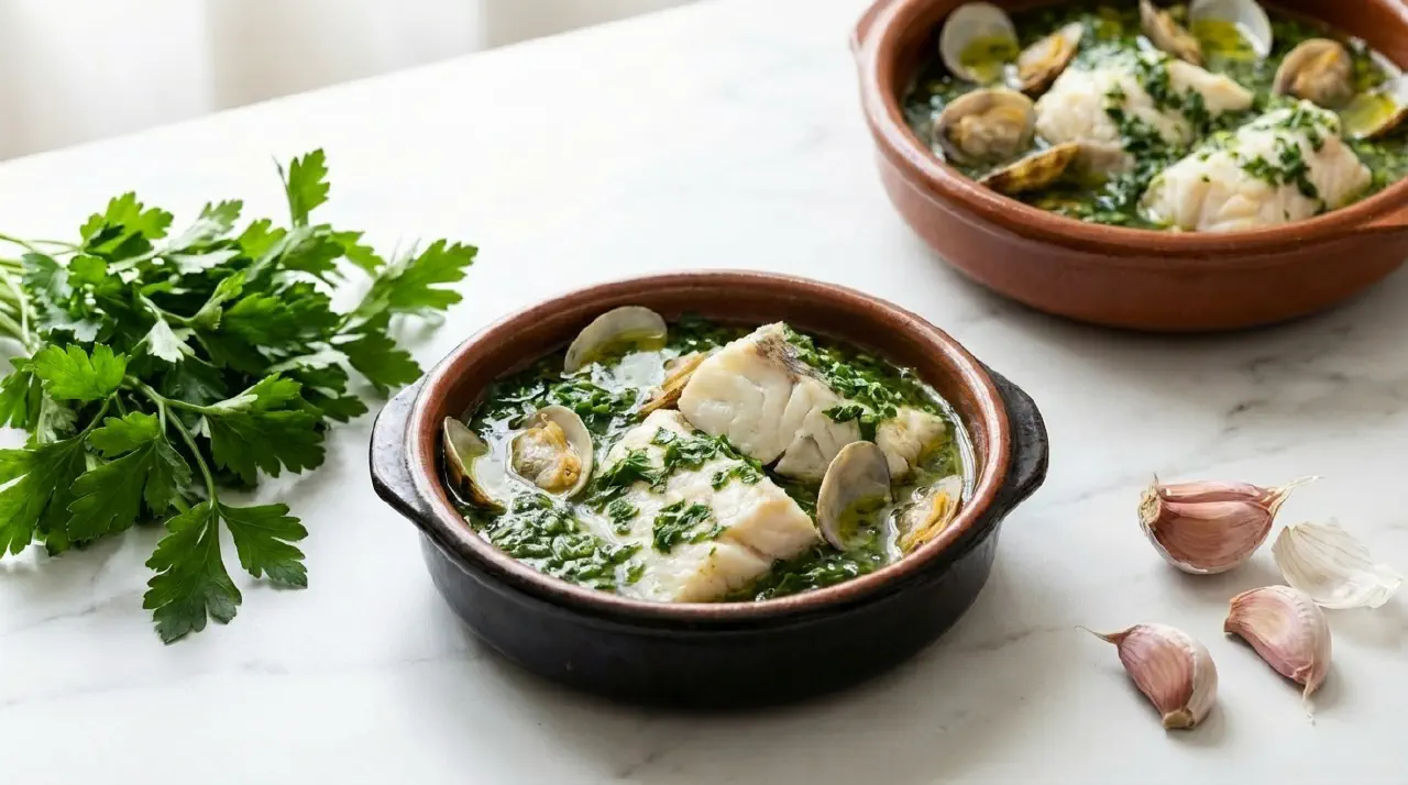 En meljævnet, fondbaseret persillesovs fra Baskerlandet. Den karakteristiske farve kommer udelukkende fra persille – ingen andre urter. Fisken pocheres forsigtigt i den færdige sovs. Den traditionelle baskiske teknik involverer at svinge panden frem for at røre med en ske.