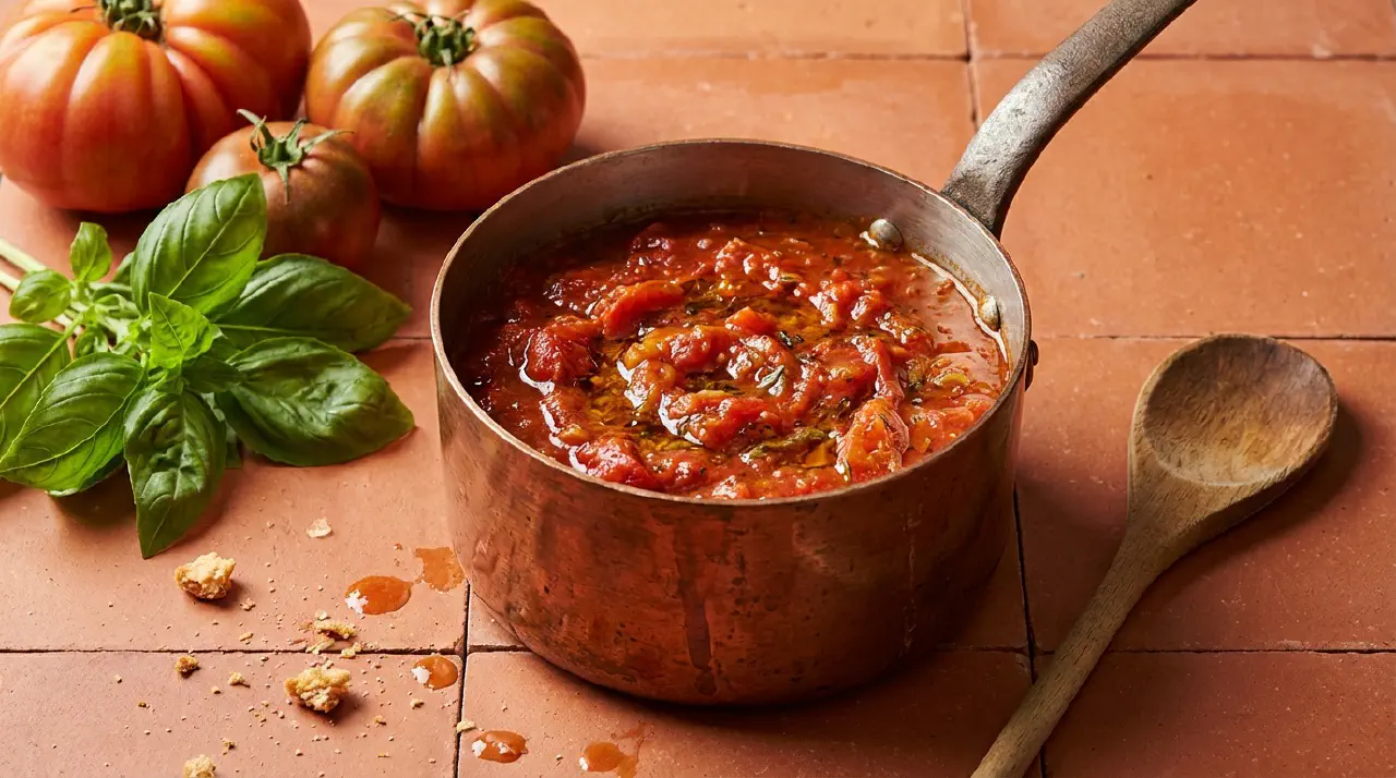- Bring kort i kog, sænk derefter varmen til lav. Simr uden låg i 30-40 minutter under lejlighedsvis omrøring, til den er fortykket og den rå tomatsmag er kogt ud.