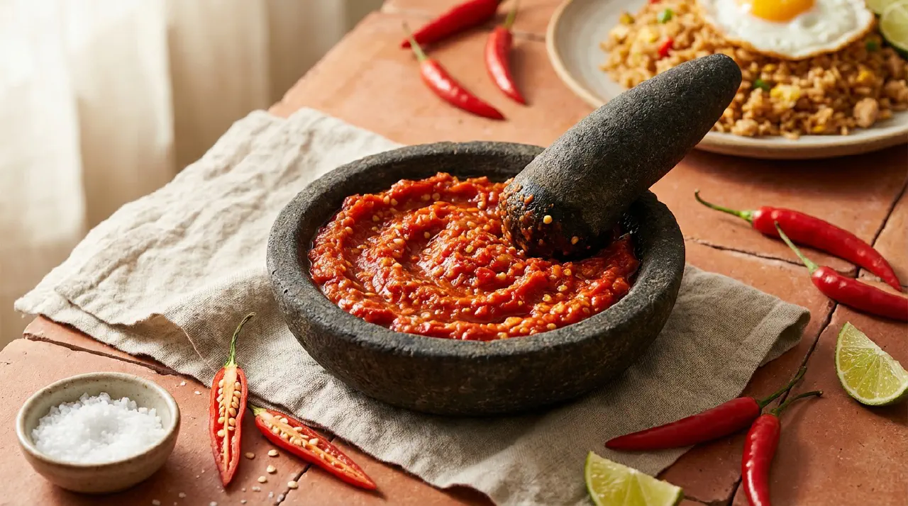 Sambal ølek er den mest basale indonesiske chilipasta – bare friske røde chilier og salt, malet til en grov konsistens. Navnet betyder “malet med en støder.” Den bruges som basisingrediens til andre sambals (sambal terasi, sambal bajak, sambal bawang) og som bordkondiment i sig selv.
