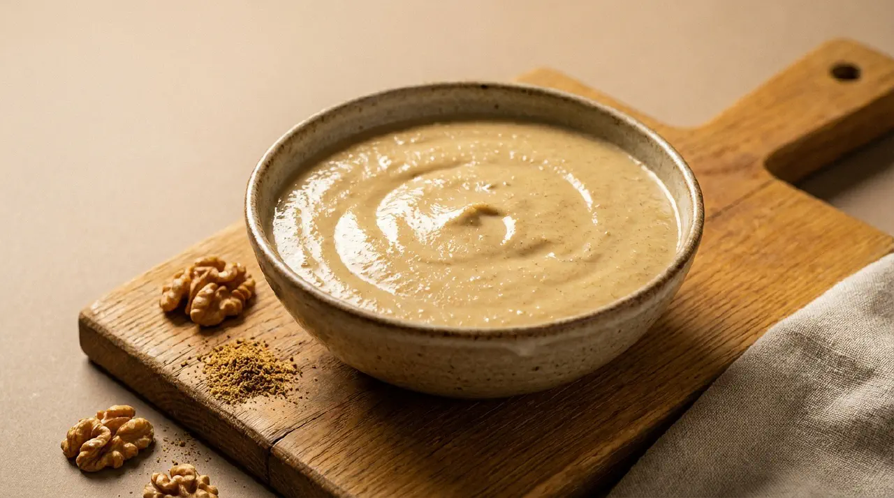 - Overfør valnøddepastaen til en stor gryde. Tilsæt korianderfrø, bukkehorn, morgenfrue, kanel, chiflager og nelliker. Bland godt. Rør eddiken i. Tilsæt gradvis varm hønsebouillon under grundig omrøring mellem hver tilsætning, til saucen har konsistens som flydende yoghurt – tyk men flydende. Det kræver ca. 800 ml til 1 liter.
