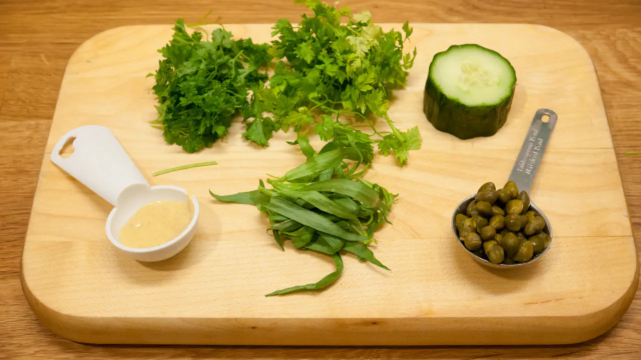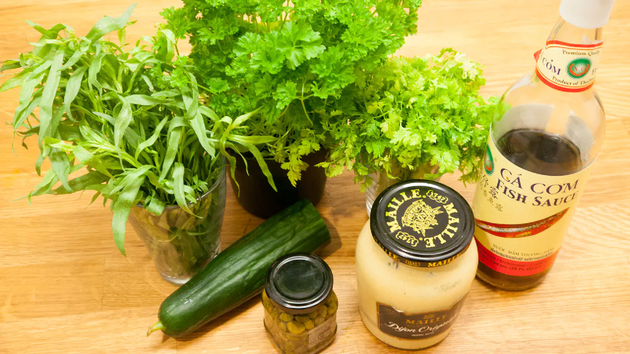 Finthak agurker, kapers, persille, kørvel og estragon.