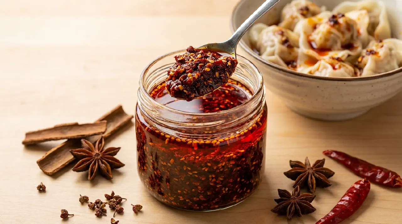 Sichuan-chiliolie er et grundlæggende tilbehør i sichuan-køkkenet. Dette er den aromatiske version (xiangla hongyou), med stjerneanis, kassia og ingefær infunderet i olien inden den kombineres med malede chili ved hjælp af en tre-temperatur-hældning. Hver temperatur udtrækker forskellige chiliforbindelser: høj varme for duft, middel for farve, lav for krydderi.