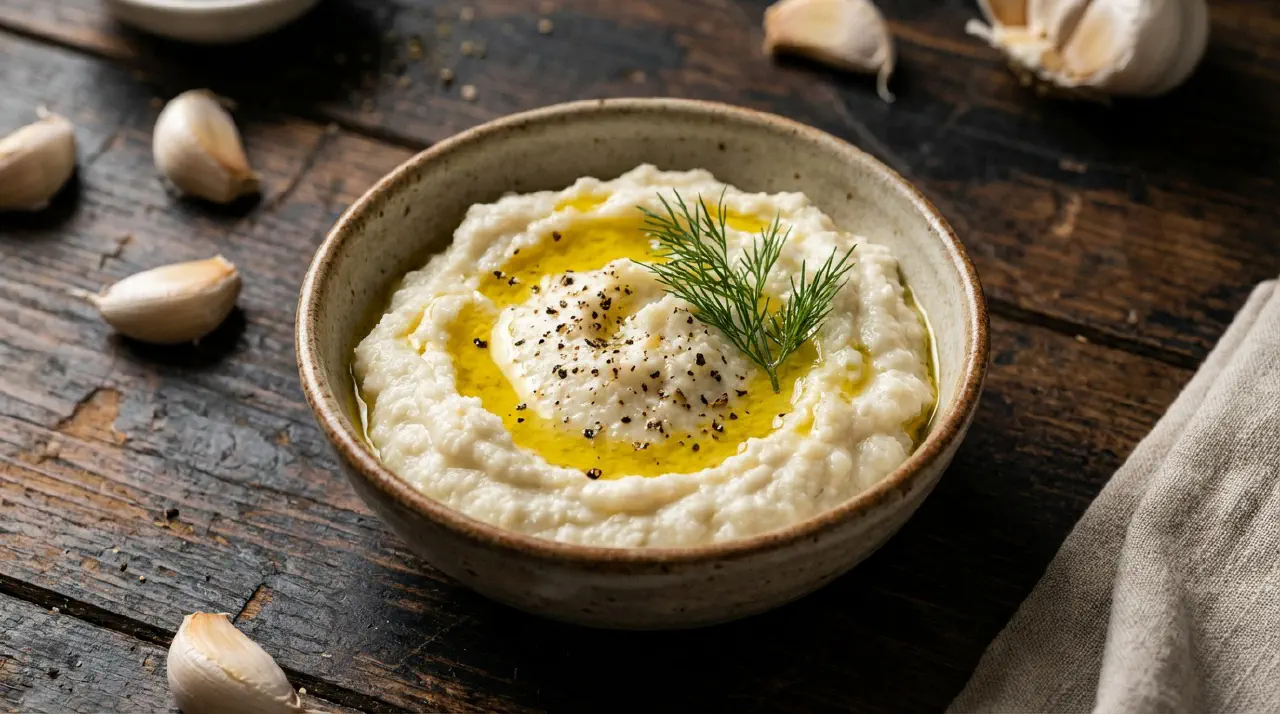 Skordalia er en græsk hvidløgs- og kartoffeldip, fortykket med olivenolie i stil med at lave mayonnaise. Den er kraftig, cremet og serveres ved stuetemperatur ved siden af stegt torsk, stegte grøntsager eller brød. Nøglen er at mose kartoflerne i hånden – brug aldrig en foodprocessor, som gør dem klæbrige.