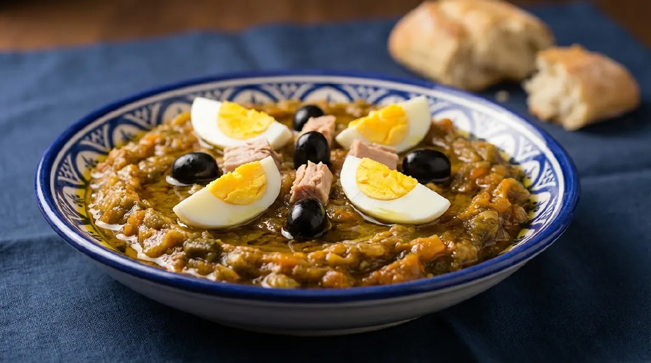 En tunesisk salat af forkullet peber og tomater, pillede og hakket til en klumpet relish med stødt kommen som signaturkrydderi. Traditionelt grillet over en kulkanoun. Pyntet med hårdkogte æg, dåsetun og oliven og serveret med brød.