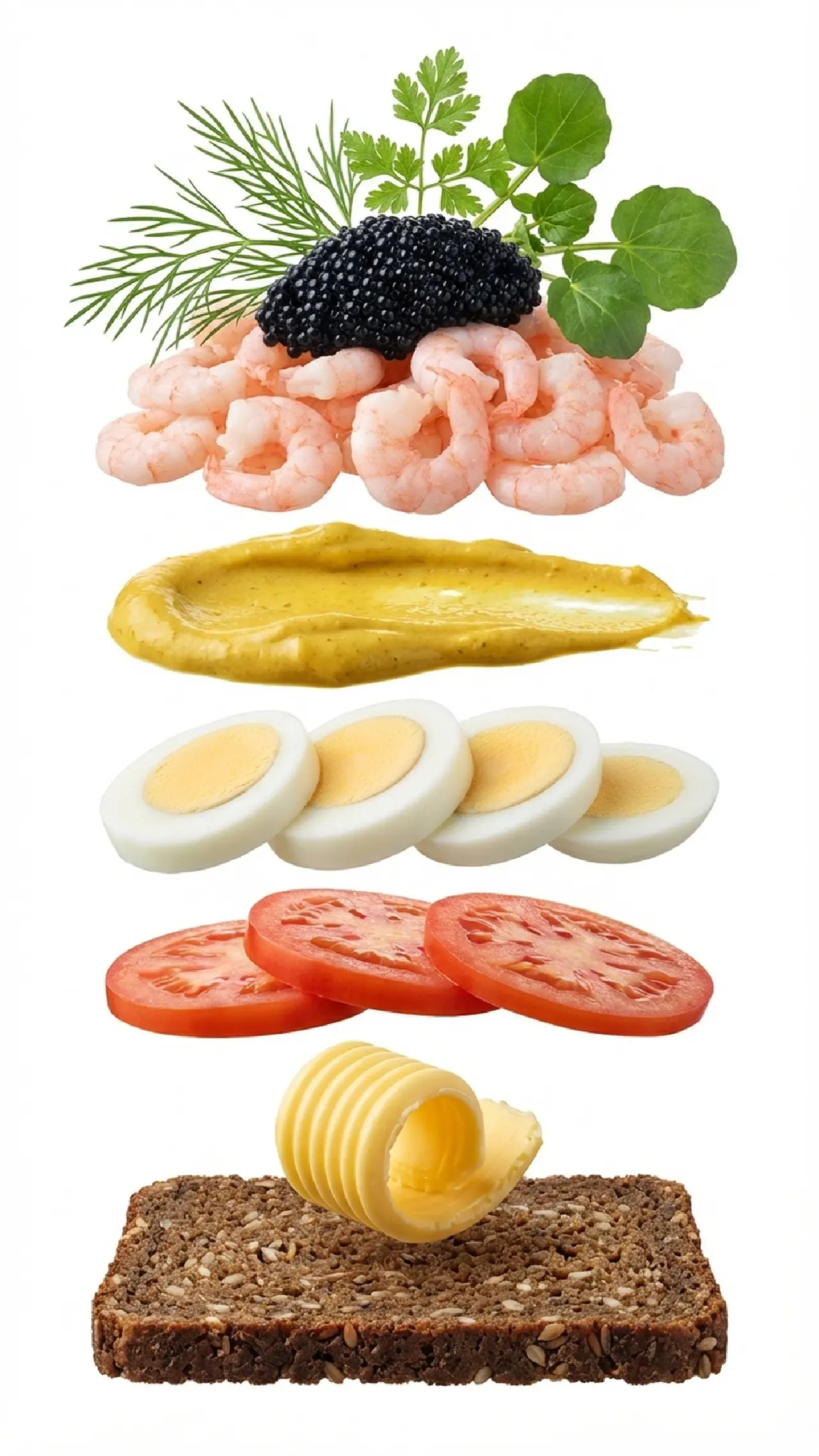 Smør brødet. Læg tomatskiver i et lag. Fordel æggeskiverne ovenpå. Stryg en generøs mængde karrymayo over æggene. Fordel rejerne på toppen. Sæt en klat stenbiderrogn i midten. Pynt med dild, kørvel, brøndkarse og en citronskive.