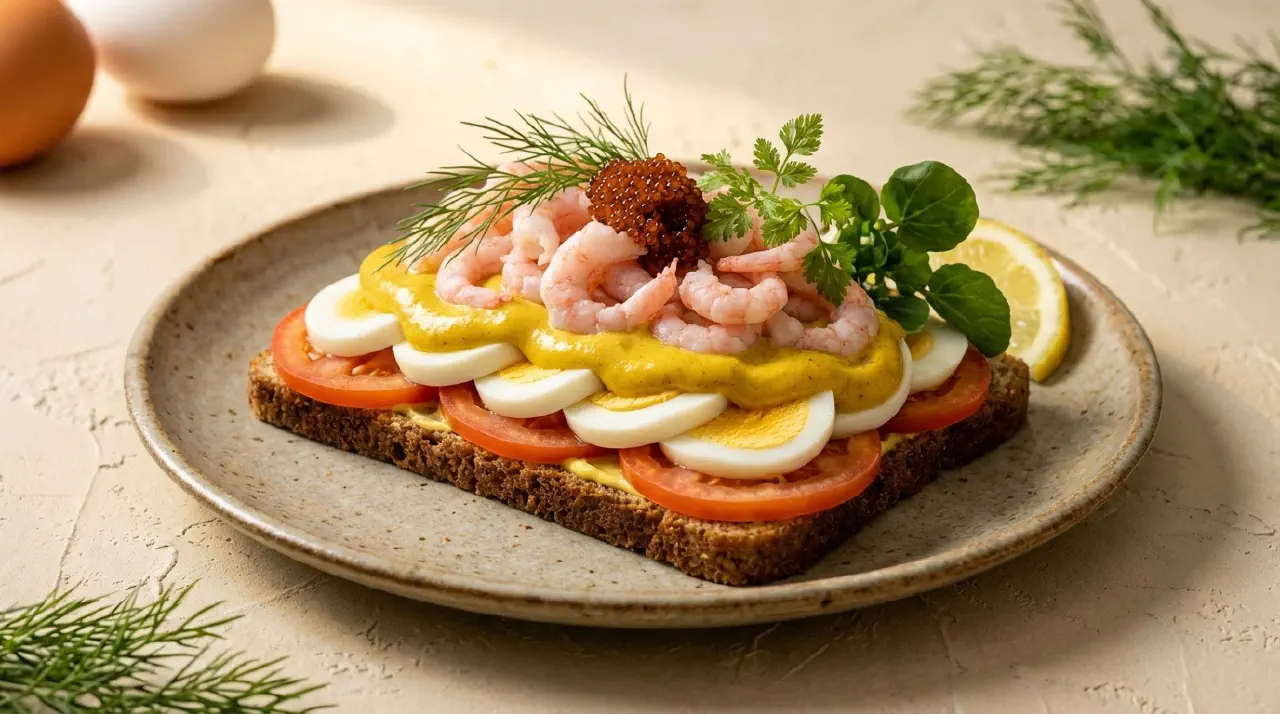 Æg og rejer er sandsynligvis det smørrebrød, der sælges flest af i Danmark — det er fast inventar på ethvert smørrebrødsbord og i enhver kantineordning. Kombinationen af hårdkogt æg og rejer er så grundlæggende dansk, at den næsten ikke behøver introduktion. Her opgraderes den med karrymayo i stedet for almindelig mayo, og stenbiderrogn tilføjer en salt, sprød tekstur. Karrypulveret trækker tråde til den danske tradition for mild karry, som har præget dansk mad siden 1700-tallet. Tricket er at koge æggene præcist — 9 minutter giver en let cremet midte, der fungerer som en slags naturlig sauce, når man tager en bid.