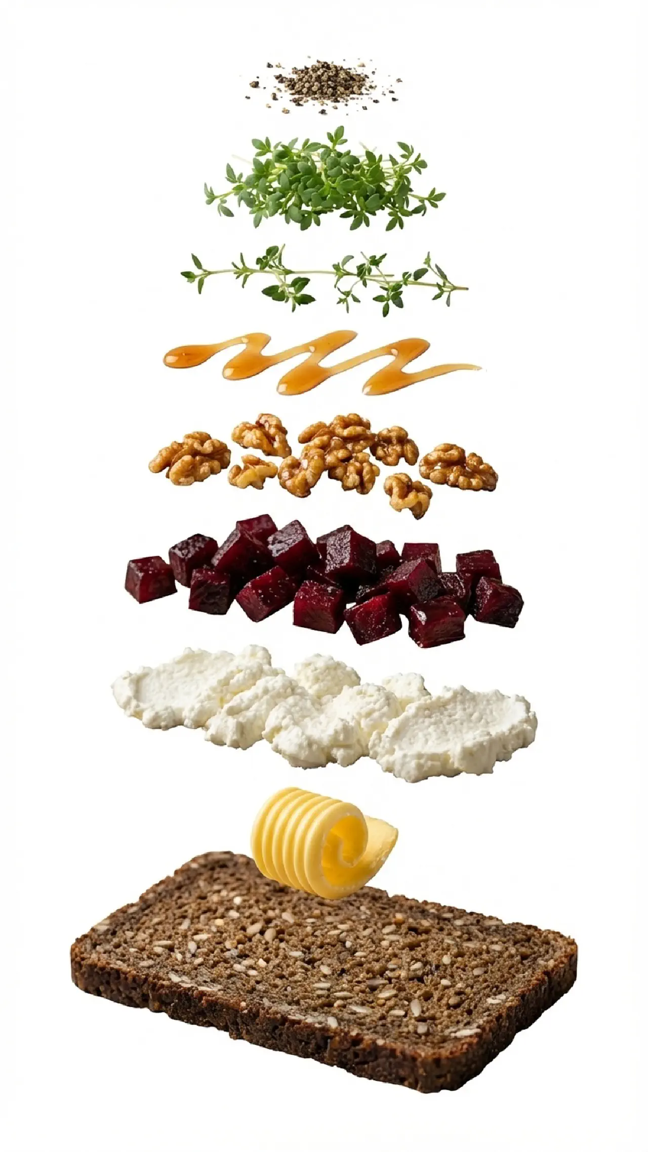 Smør rugbrødet. Fordel gedeost i klatter. Fordel stegte rødbeder ovenpå. Drys med valnødder. Dryp honning over. Pynt med timian, karse og peber.