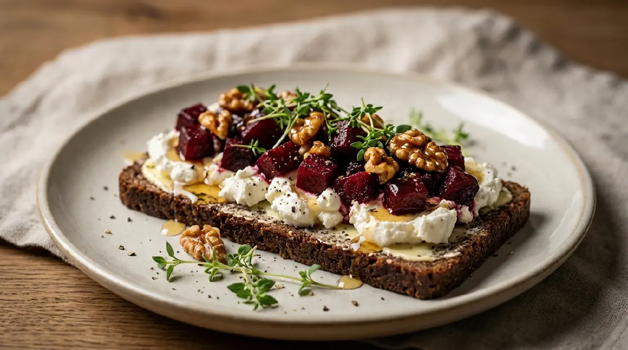 Gedeost og rødbeder er en kombination, der er blevet populær på moderne smørrebrødsrestauranter i de senere år. Den cremede gedeost har en syrlig, let skarp smag, der passer til rødbedernes jordede sødme, især når de er bagt med balsamico og timian. Honningen binder de to sammen med sin blomsteragtige sødme, og de ristede valnødder giver knas og nøddeagtig dybde. Farvemæssigt er det et af de smukkeste smørrebrød med de dybe rubinrøde rødbeder mod den hvide ost på det mørke rugbrød.