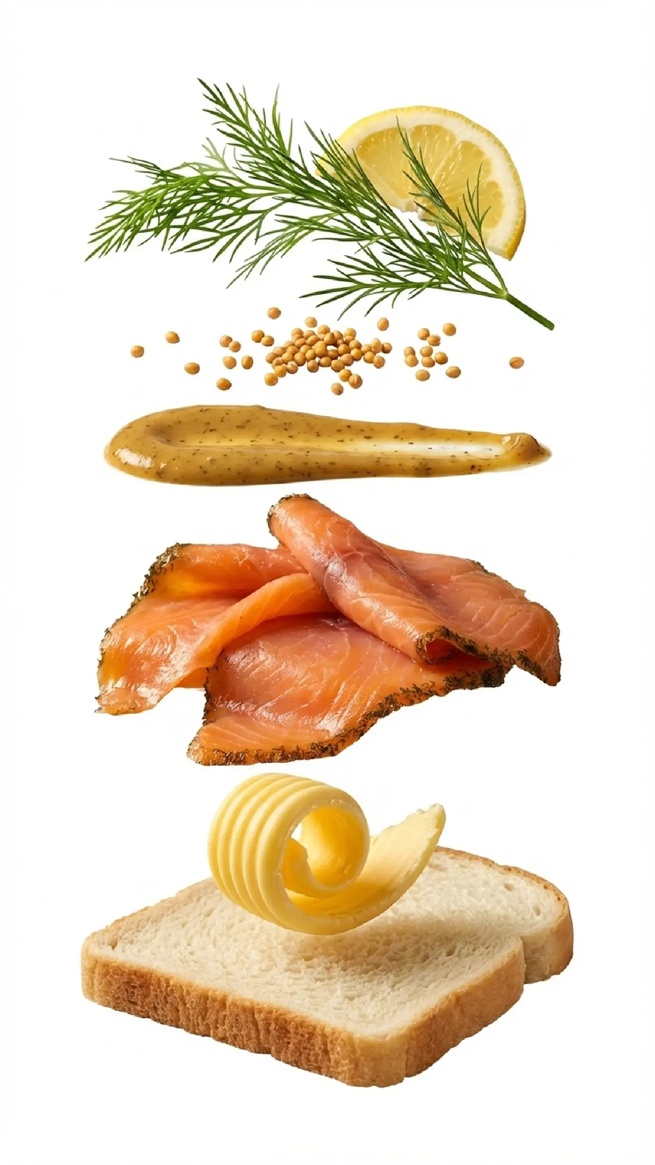 Gravad laks er en ældgammel skandinavisk konserveringsmetode, hvor laksen “begraves” i salt, sukker og dild — ordet “grav” refererer bogstaveligt til at begrave. Rævesovsen, også kaldet hovmestersauce, er den uundværlige følgesvend med sin sød-skarpe sennepssmag og fylde af frisk dild. De ristede sennepsfrø tilføjer et sprødt, nøddeagtigt element, der er uventet og velkomment. Gravlaksen har en fastere, mere “rå” tekstur end røget laks og en renere smag, hvor dillen og saltlagens krydderier dominerer. Det er et festsmørrebrød med dybe rødder i nordisk madhistorie og et fast indslag ved enhver ordentlig dansk frokost.