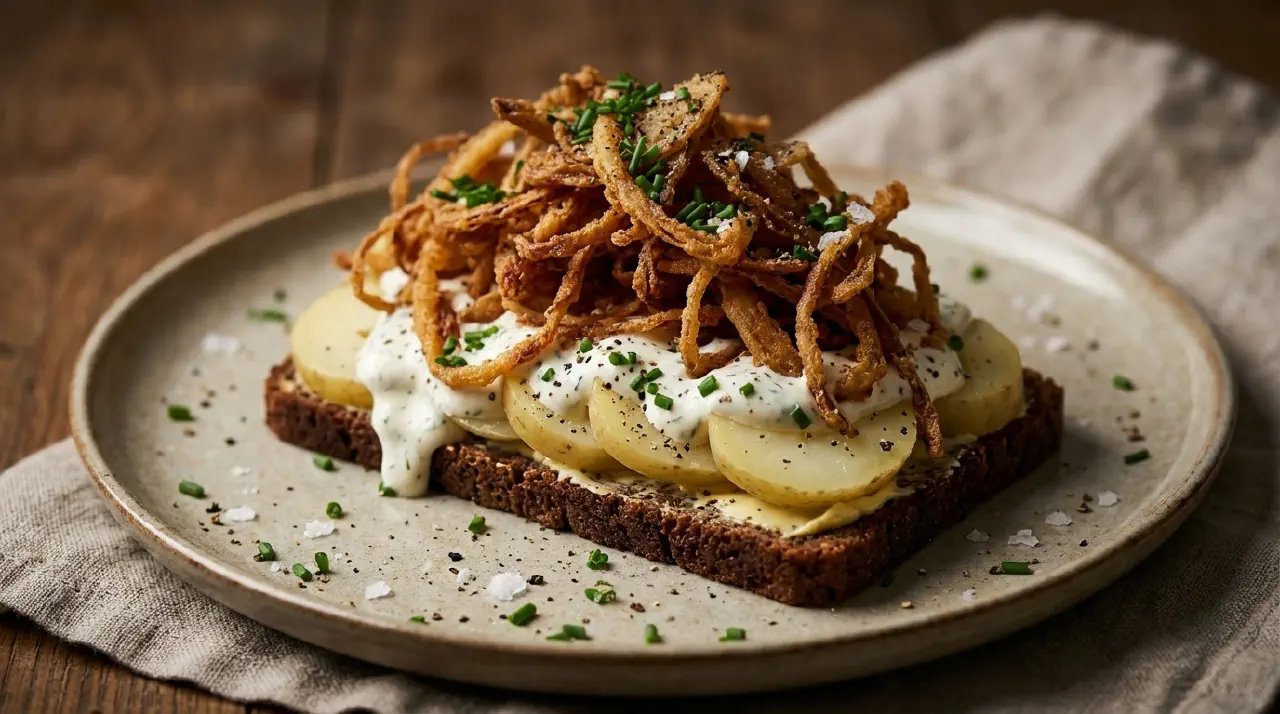 Kartoffelmad er et af de mest elskede danske smørrebrød og hører uløseligt til sommeren, når de nye kartofler er i sæson. De kogte kartofler skæres i tykke skiver og lægges på smørret rugbrød, og dildmayoen tilfører den friske, anisagtige smag, der er en fast del af den danske sommer. De hjemmelavede ristede løg giver sprødhed og karamelliseret sødme, som er en helt anden oplevelse end de købte. Det er et vegetarisk smørrebrød, som selv de mest overbevist kødelskende ikke siger nej til.