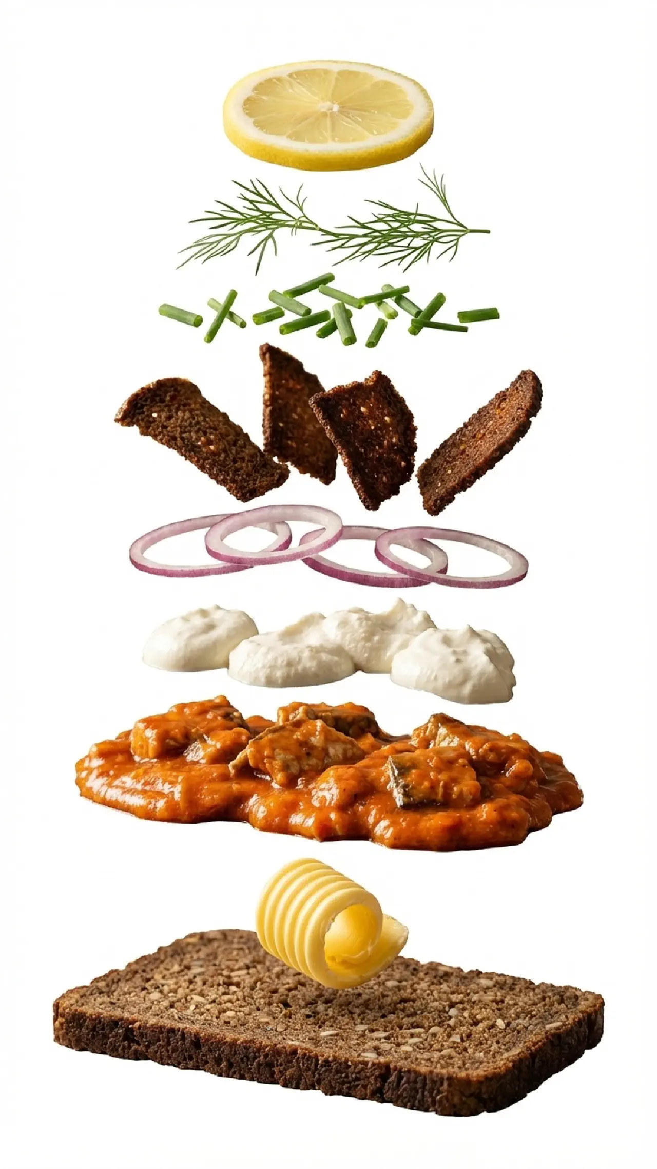 Makrel i tomat er et af Danmarks mest folkelige pålæg — en dåse makrel i tomat i køleskabet er nærmest en kulturel markør. Det er billigt, nærende og smager af barndom for mange danskere. Her opgraderes det fra køkkenbordsmad til ordentligt smørrebrød med hjemmelavet peberrodscreme, der giver et skarpt bid mod tomatens sødme, og sprøde rugbrødschip, der tilfører knas. Rødløgsringene giver friskhed og skarphed. Det er stadig hverdagsmad i sin sjæl, men med den slags tilbehør, der viser, at man har taget sig tid til at gøre det ordentligt.