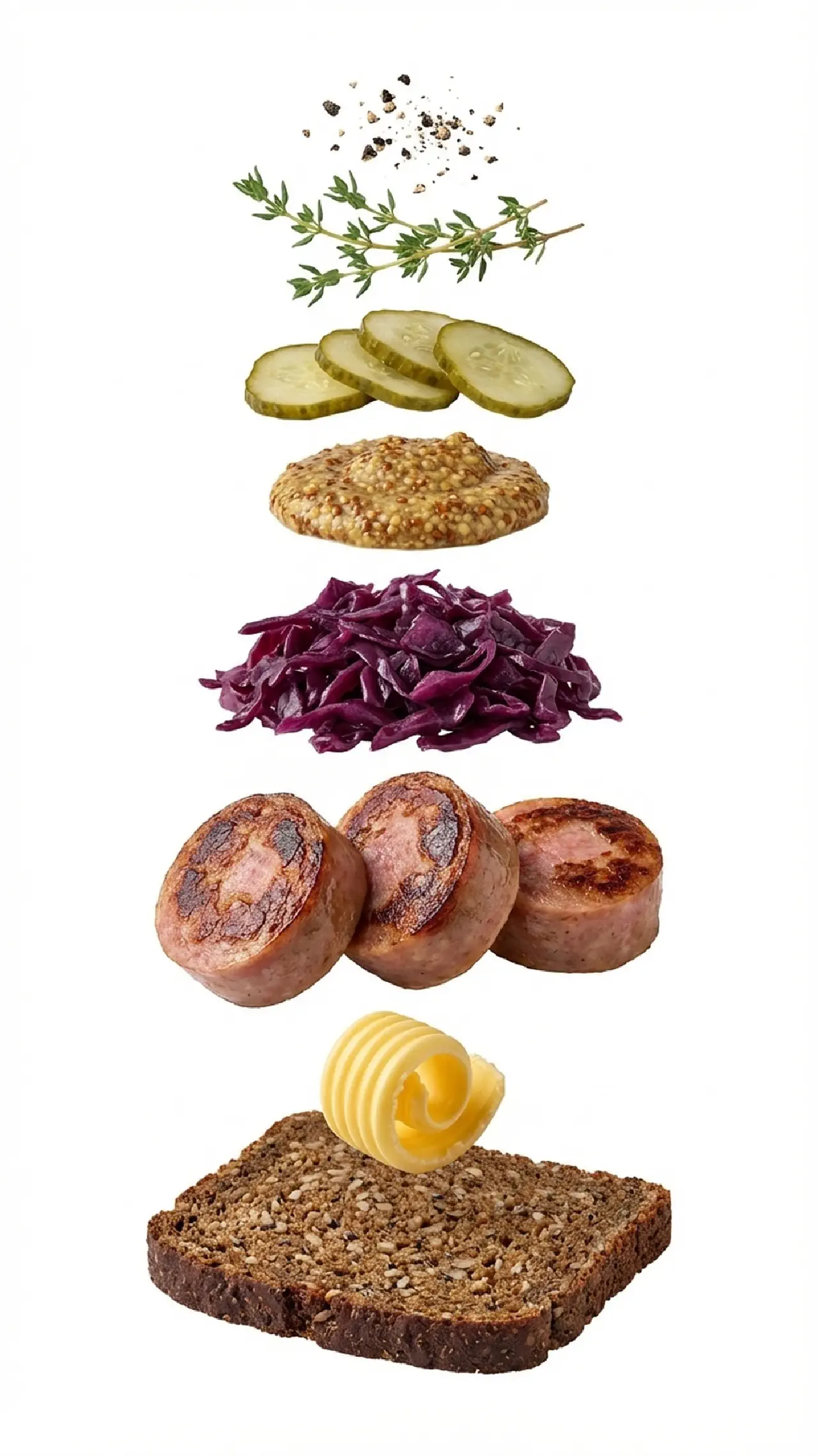 Smør rugbrødet. Læg de varme medisterpølseskiver på. Fordel rødkål ved siden af pølsen på brødet. Sæt en klat grovkornet sennep oven på pølseskiverne. Læg syltede agurker ovenpå. Pynt med timian og peber.