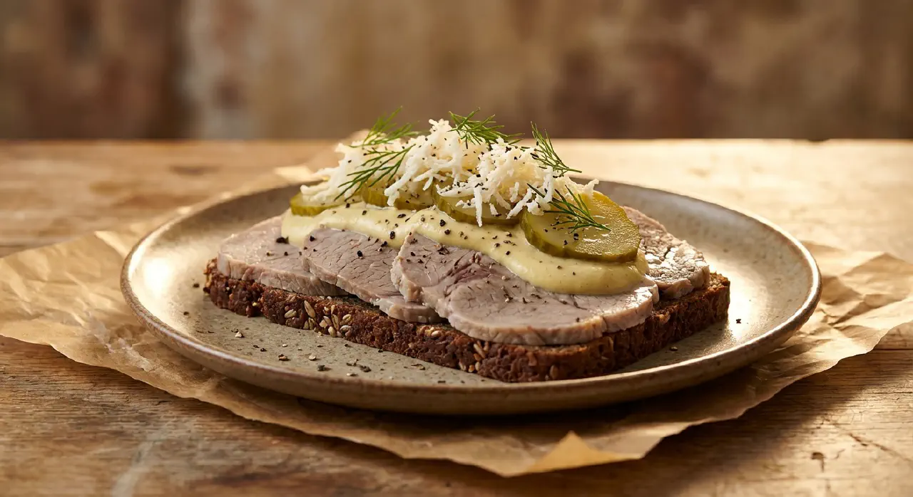 Smørrebrød med oksebryst, sennep og syltede agurker