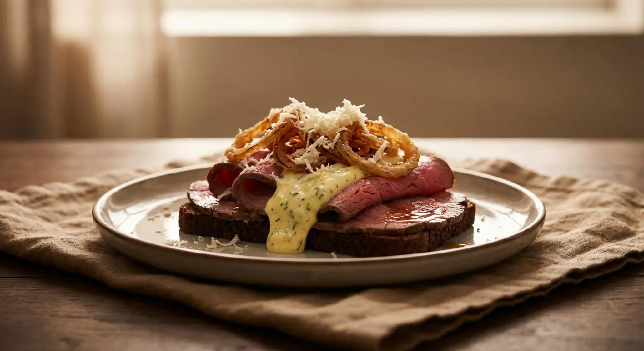 Roastbeef med remoulade og ristede løg er en af smørrebrødets tungvægtere og et fast indslag på ethvert dansk frokostbord. Roastbeefen skal være rosa i midten — gennemstegt kød har ingen plads her — og skæres i tynde skiver, der foldes i bløde bølger på brødet, aldrig lægges fladt. Remouladen er den danske version, som med sin gurkemeje, estragon og hakkede pickles har en helt anden karakter end den franske original. De sprøde ristede løg giver knas og sødme, mens frisk revet peberrod, revet direkte over retten, bidrager med en varme, der vækker ganen. Det er et smørrebrød, der lever og dør med kødet — brug et godt stykke oksekød og steg det med omhu.