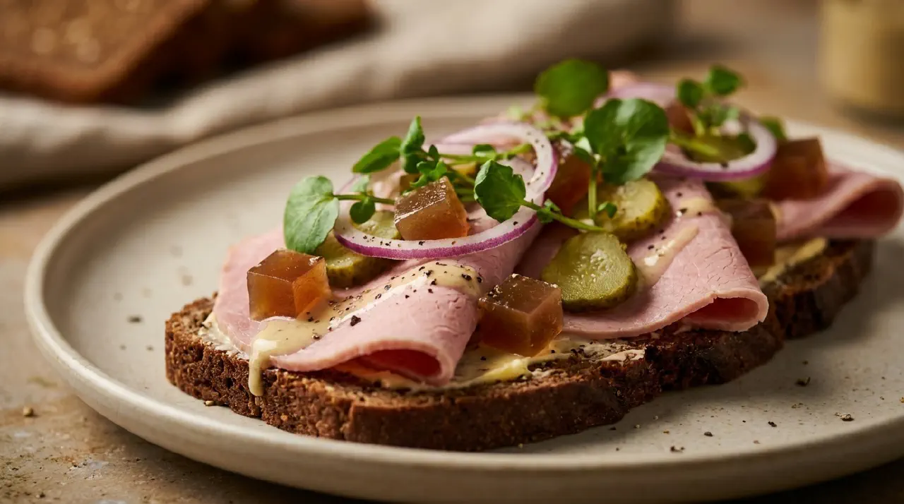 Smørrebrød med saltkød, sky og sennepsvinaigrette