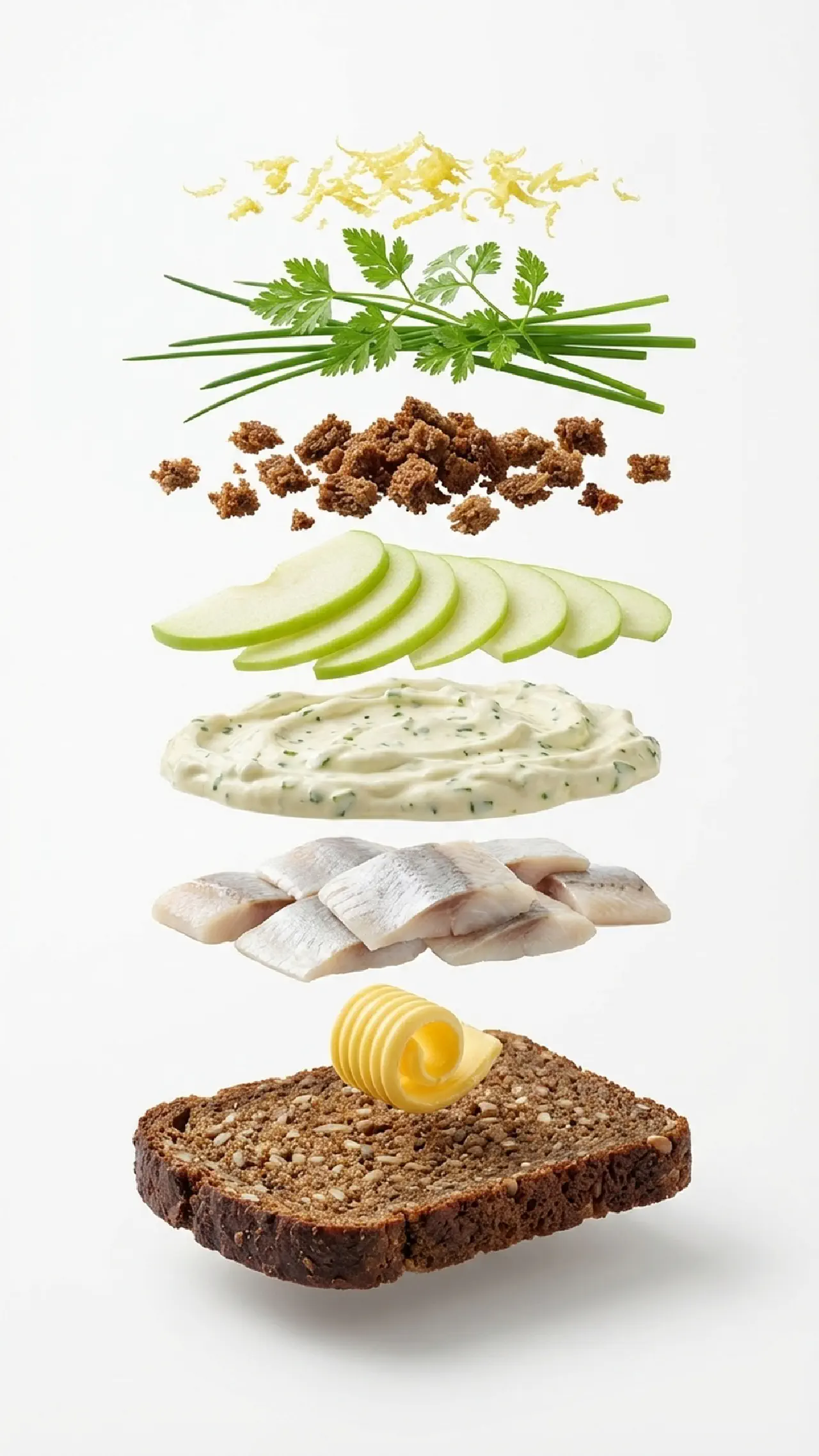 Denne sildemad handler om kontraster i tekstur. De bløde, marinerede sild møder en frisk æble-purløgscreme og toppes med sprøde rugbrødskrummer, der giver et knas, som ellers mangler på en klassisk sildemad. Æblet i cremen tilfører en naturlig sødme og friskhed, der løfter sildens salte, syrlige karakter. Purløgen binder det skandinaviske udtryk sammen. Det er en tilgang, der er inspireret af nyere nordisk smørrebrødstænkning, hvor teksturspillet vægtes lige så højt som smagen. Rugbrødskrummerne skal laves lige inden servering — ellers mister de deres sprødhed.