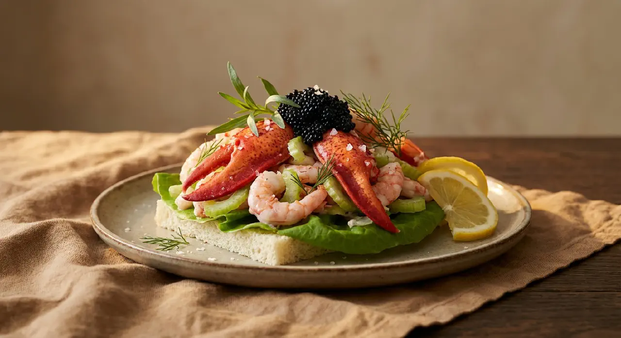 Skaldyrssalat med hummer og rejer er smørrebrødsbordets luxusudgave af den klassiske rejemad. Hummerkløerne giver en fast, kødfuld tekstur og en rig, sød smag, der komplementeres af de mindre, mere delikate rejer. Estragon-citrusdressingen er det, der binder det sammen — estragonens let aniserede tone passer til skaldyr som få andre urter gør, og citrussyren holder retten frisk. Bladselleri tilføjer knas og en grøn bitterhed, der forhindrer salaten i at blive ensformig. Det er et smørrebrød til de store lejligheder — konfirmationer, runde fødselsdage og julefrokoster — og det kræver, at man investerer i ordentlige skaldyr.