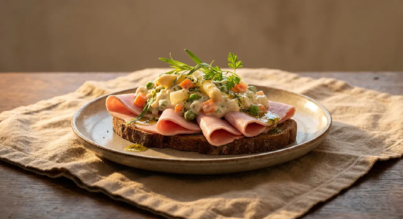 Skinke med italiensk salat er et smørrebrød, der dukker op på de fleste danske frokostborde og i kantineordninger over hele landet. Kogt skinke har en mild, let sødlig smag og en fast, saftig tekstur, der fungerer som en neutral bund for den cremede italienske salat. Italiensk salat — en mayonnaise-baseret blanding af ærter, gulerødder og hvide asparges — er en dansk opfindelse, der trods navnet intet har med det italienske køkken at gøre. Urtevianaigretten med estragon og kørvel tilføjer en frisk, aromatisk dimension, der løfter retten fra det hverdagsagtige. Det er et solidt, ukompliceret smørrebrød, der aldrig skuffer, men heller aldrig forsøger at overraske.