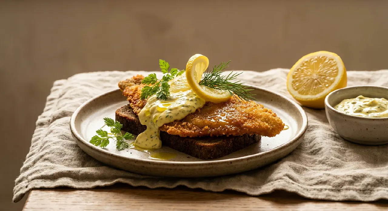 Stegte rødspættefileter er et kerneemne i dansk smørrebrød og har været fast inventar på frokostrestauranter i over hundrede år. Rødspætten paneres i mel, æg og panko og steges i smør, så den får en gylden, sprød skorpe, mens fisken indeni forbliver saftig og hvid. Remouladen er den klassiske partner — en dansk mayo-baseret sauce med hakket pickles, kapers, estragon og gurkemeje, der har en helt anden karakter end den franske original. Citronolien tilføjer en frisk, syrlig tone, der løfter det hele. Det er et smørrebrød, hvor kontrasten mellem den sprøde fisk og den cremede remoulade er hele pointen.