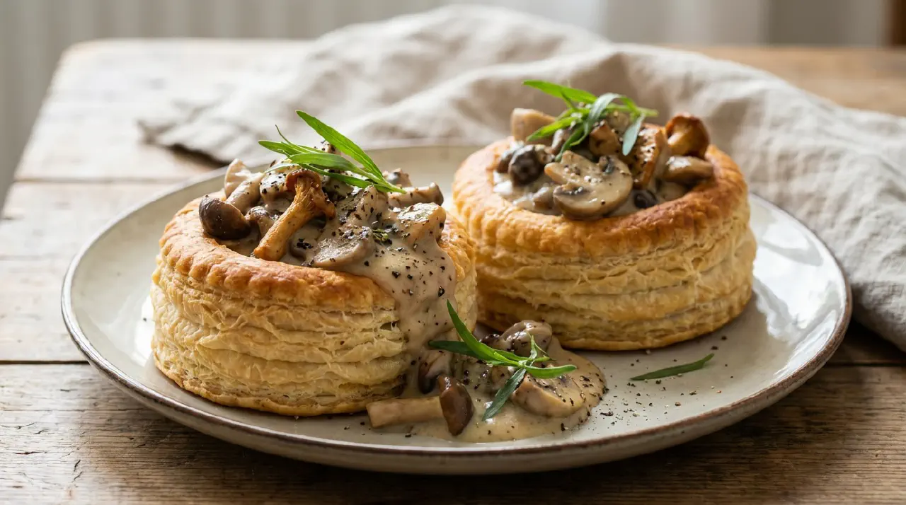 En vegetarisk version af tarteletten med en cremet svampefyldning og frisk estragon. Brug blandede svampe for bedst smag — champignon, shiitake og karl johan fungerer godt sammen. Estragon og svampe er et klassisk par i det franske køkken og virker fint her.