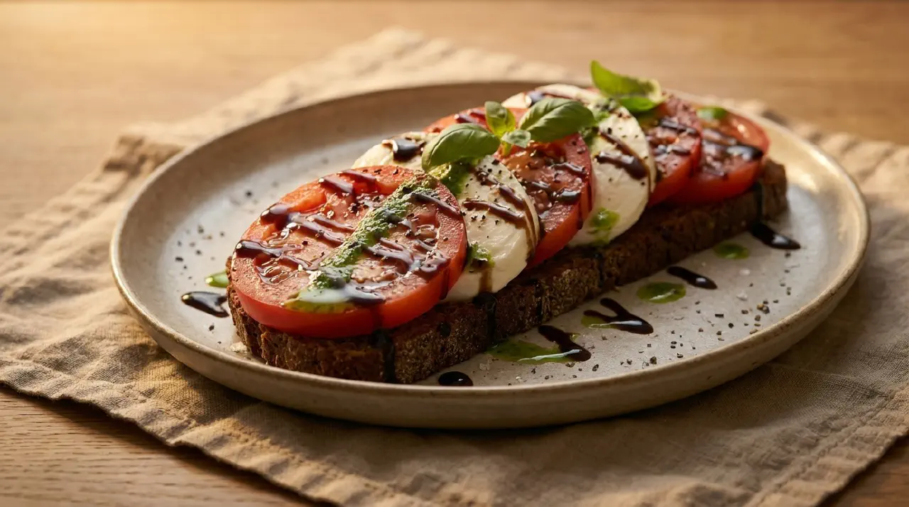 Tomatmad med mozzarella og basilikum er i bund og grund en italiensk caprese oversat til det danske smørrebrødsformat på mørkt rugbrød. Rugbrødets maltede, syrlige smag giver faktisk en mere interessant base end det hvide brød, man normalt bruger til caprese. Brug modne, sæsonens tomater — gerne i forskellige farver for variation i både smag og udseende. Basilikumolien koncentrerer urtens smag og giver en intens, aromatisk finish, mens balsamicoglazen tilføjer en sød-syrlig dybde, der binder det hele sammen.