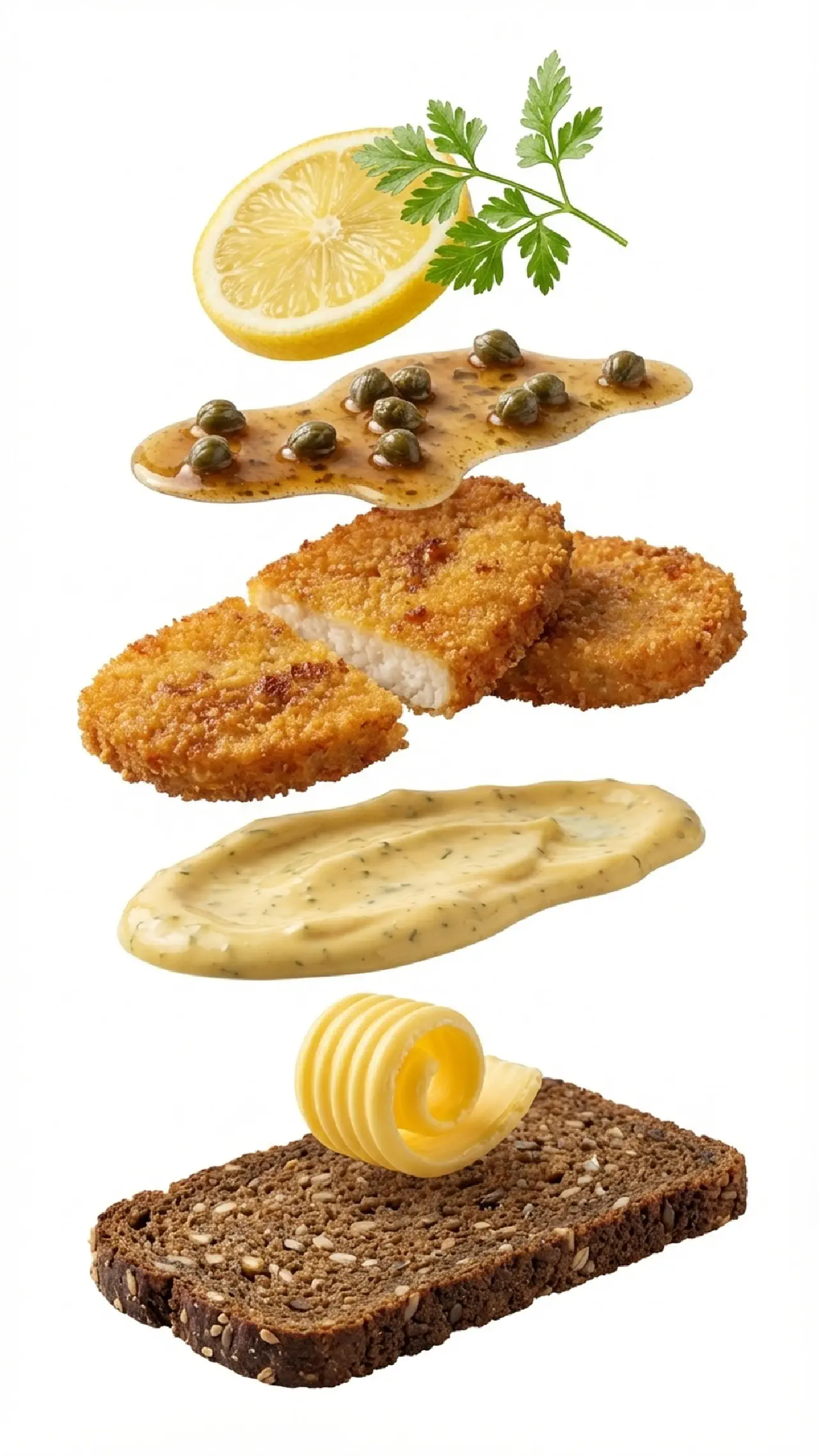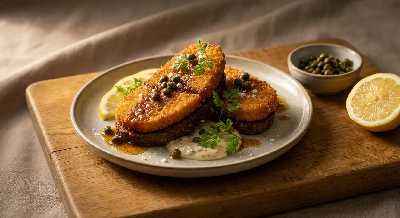 Torskerogn på smørrebrød er en gammel tradition, der var hverdagsmad i kystbyerne, hvor rognen var et billigt biprodukt af torskefiskeriet. Rognen koges først, skæres i skiver og paneres, så den får en sprød overflade, mens indersiden forbliver blød og cremet med en mild, let sødlig fiskeagtig smag. Kaperssmørret er en klassisk fransk teknik — beurre noisette — der her bruges til at tilføje en nøddeagtig dybde og salte kaperseksplosioner. Kørvel, med sin milde anissmag, er den traditionelle urt til torskerogn i dansk køkken. Det er et smørrebrød, der er ved at forsvinde fra mange frokostmenuer, hvilket er ærgerligt, for det er et af de mere interessante.