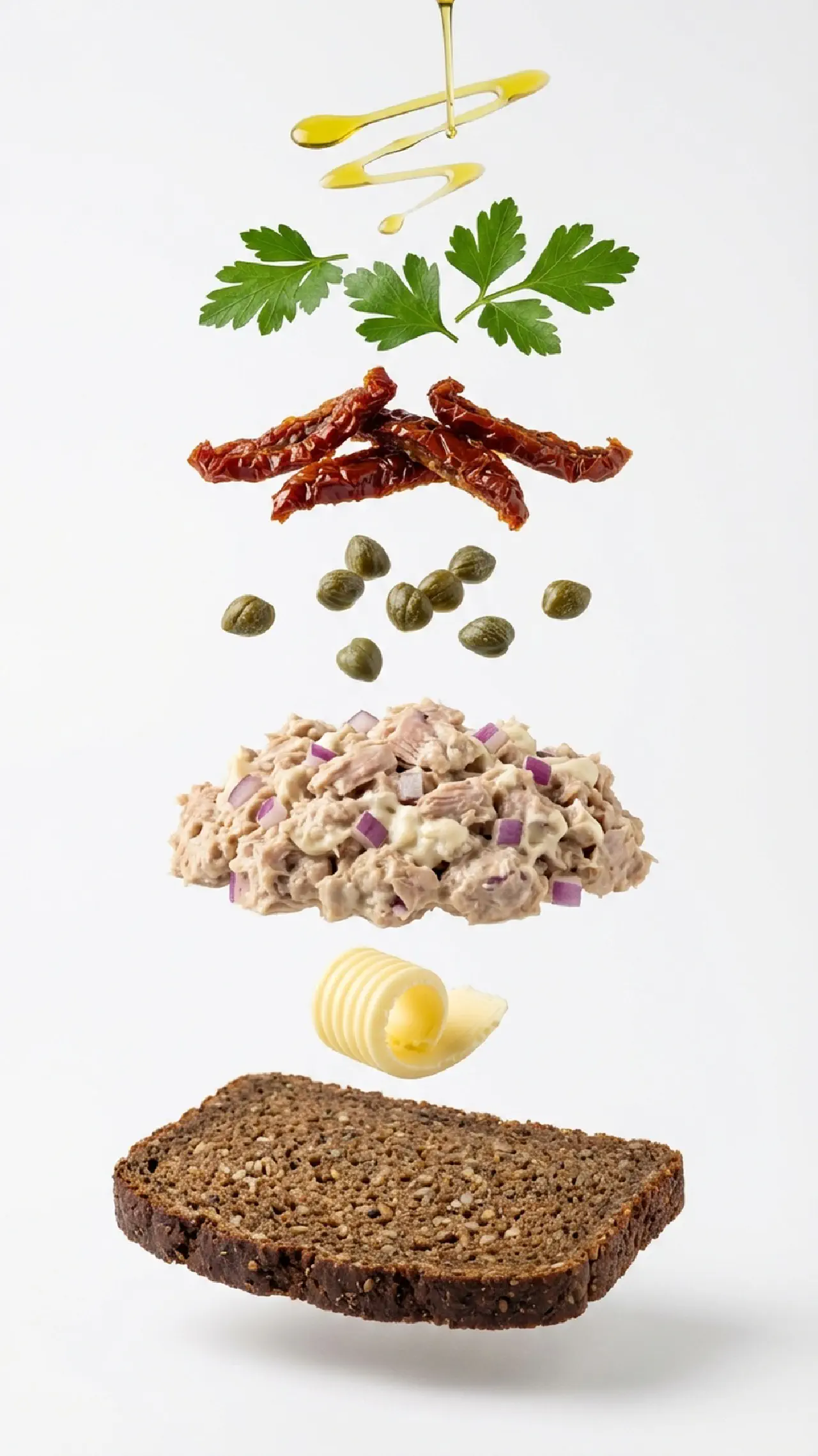 Smør rugbrødet. Fordel tunfiskesalaten. Top med kapers og soltørrede tomatstykker. Dryp med god olivenolie. Pynt med frisk persille og flagesalt.