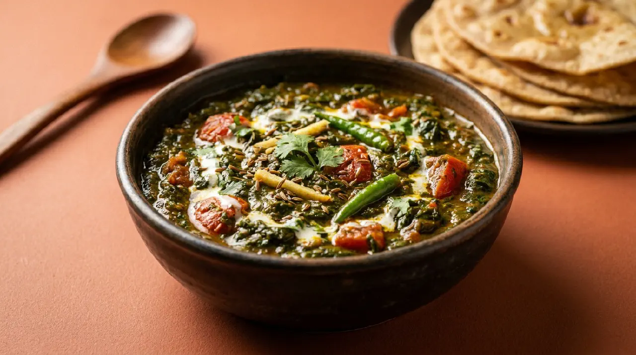 Retten passer som tilbehør til et større indisk måltid med dal, ris og brød, men kan også stå alene med chapati eller naan. Konsistensen er halvtør — spinaten simrer sammen med tomaterne til en tyk mos, ikke en saucet curry.