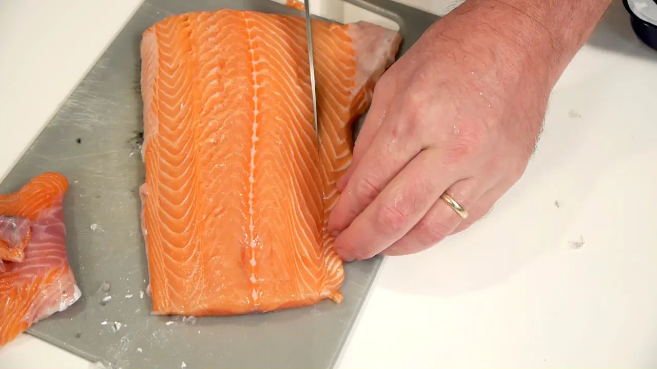 Når man køber en lakseside er der ofte skæl på. Det er meget vanskeligt at få skællene af uden at ødelægge kødet. Så det bedste er at fjerne skindet.