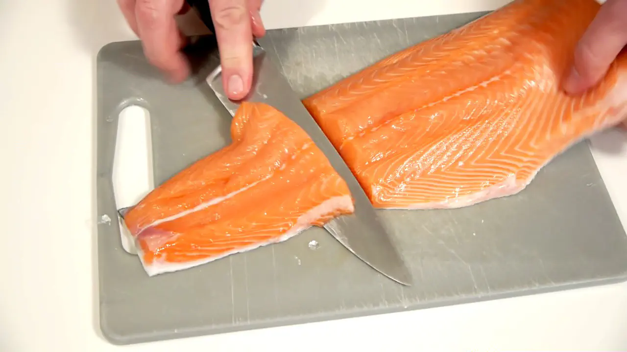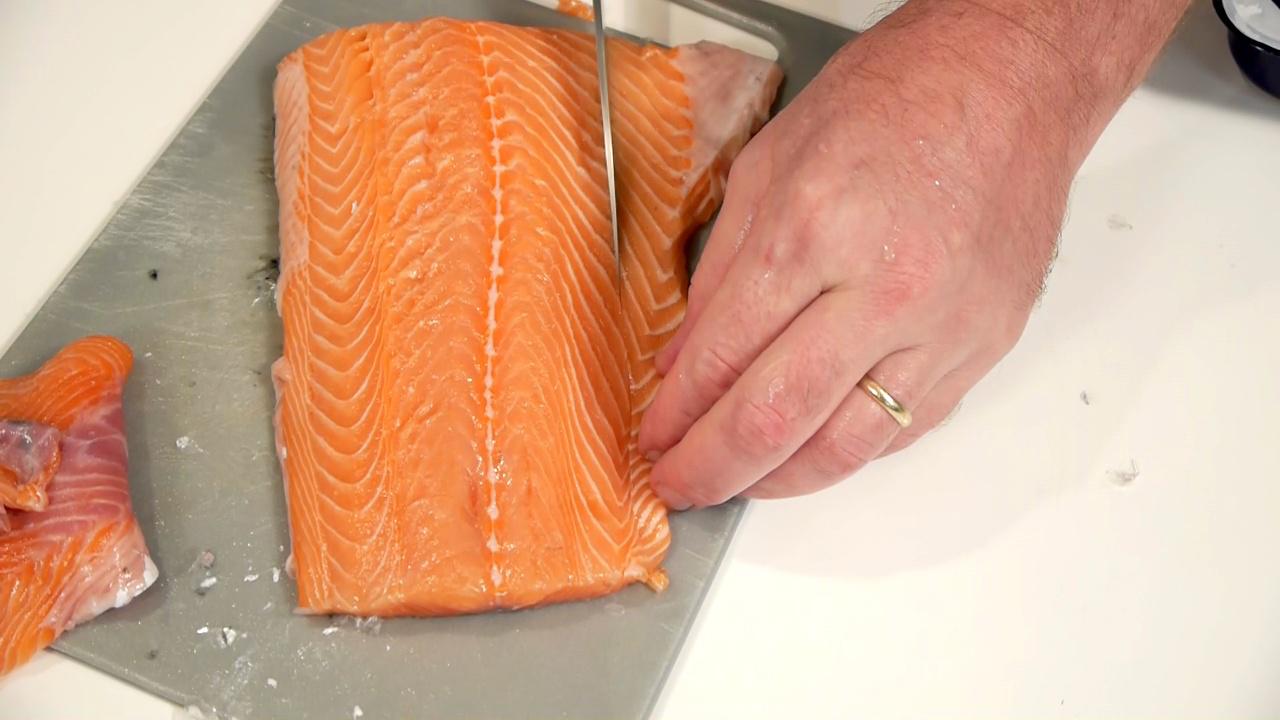 Når du afskinder laksen er det vigtigt at bruge en skarp og lang kniv.