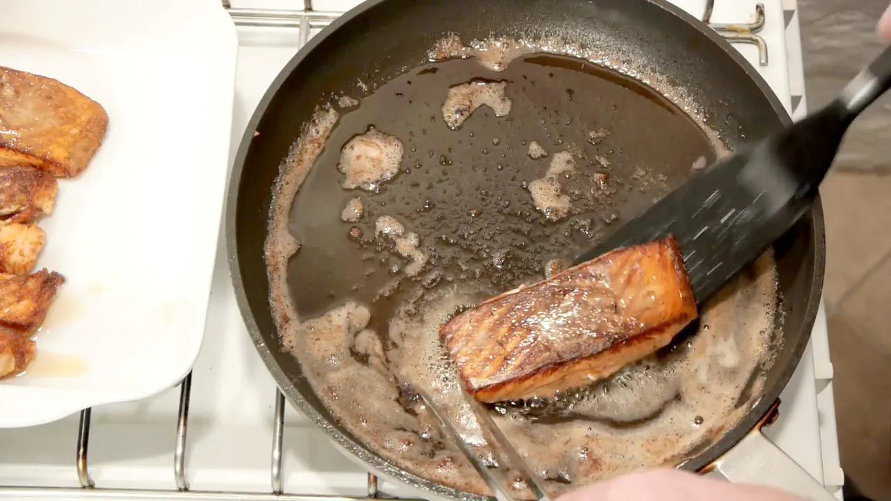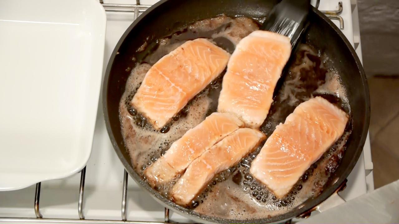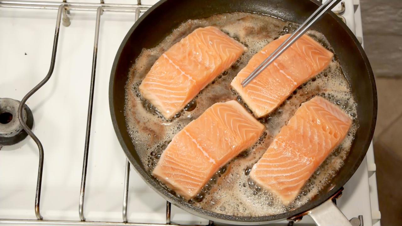 Det giver en sprød stegeskorpe og et mørt smørblød center af rosa kød. Vender man flere gange risikerer man også meget nemt at fisken falder fra hinanden.