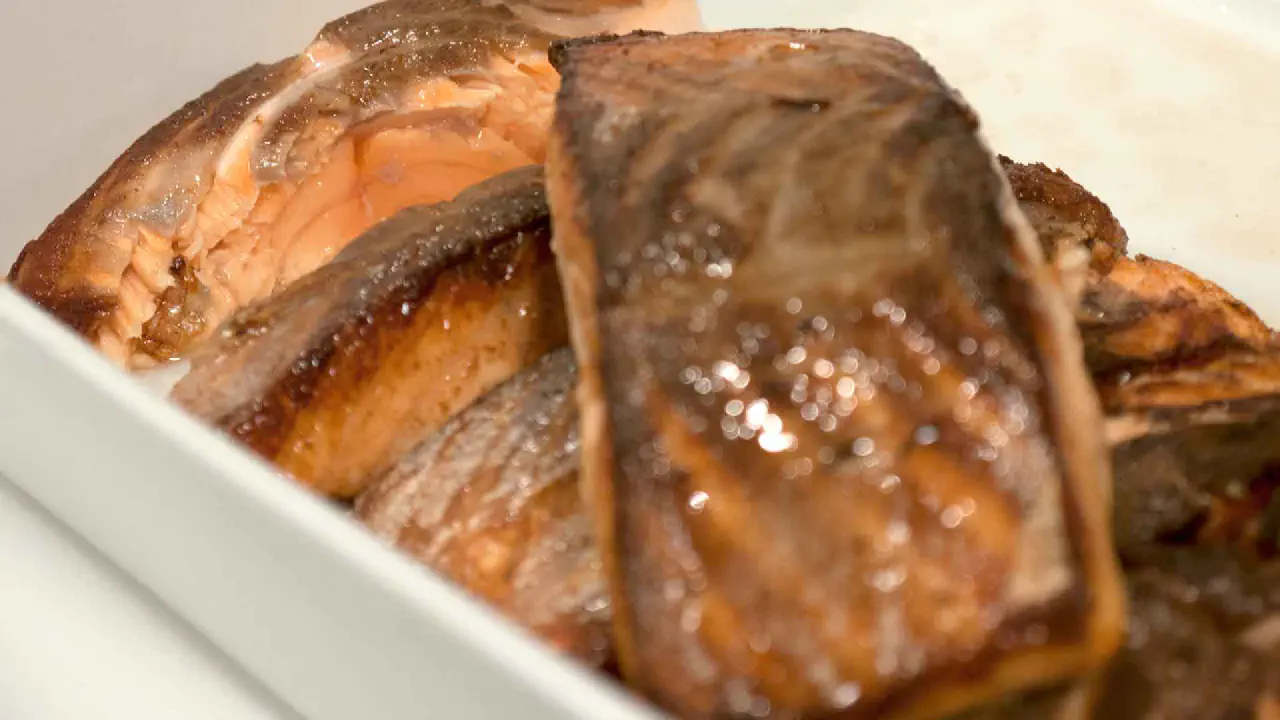 Det tynde stykke der har siddet nede ved bugen bliver meget hurtigere færdig end den tykke det af fileten. Så hvis du lader det blive siddende på er det ikke meget ved at spise. Skær det og steg det for sig. Eller lav eventuelt en forret med det.