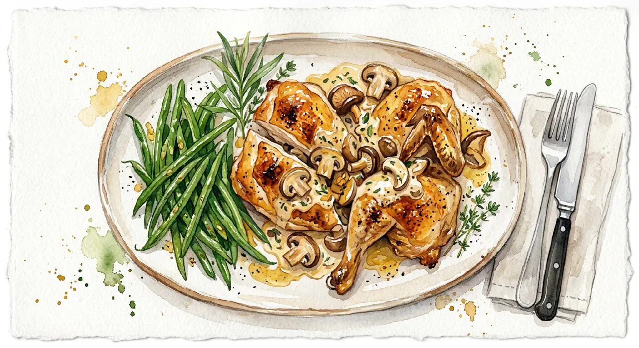 Perlehøne smager som en mellemting mellem kylling og fasan — lidt mere karakter end kylling, men mildere end vildt. Her grydsteges den langsomt med estragon og persille indeni, og serveres med en champignon-flødesovs. En fin og lidt festlig ret, der fortjener flere aftensmåltider end den typisk får.