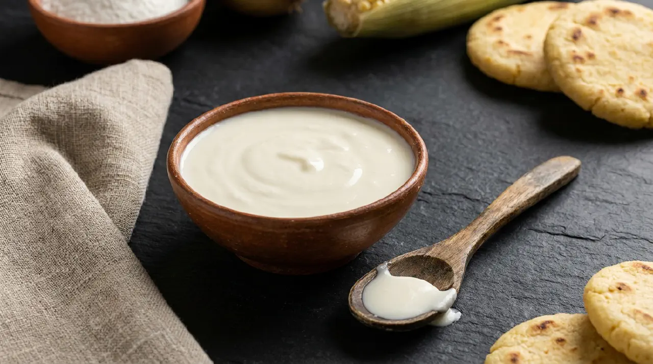 Suero costeno er et tykt, syrligt fløde-tilbehør fra Colombias caribiske kyst. Det laves ved at skille sødmælk med eddike, si osten fra og blende den glat. Traditionelle versioner bruger naturlig fermentering af rå mælk ved tropiske temperaturer; denne tilpassede metode bruger opvarmet mælk og syre til det samme resultat med pasteuriseret mælk.